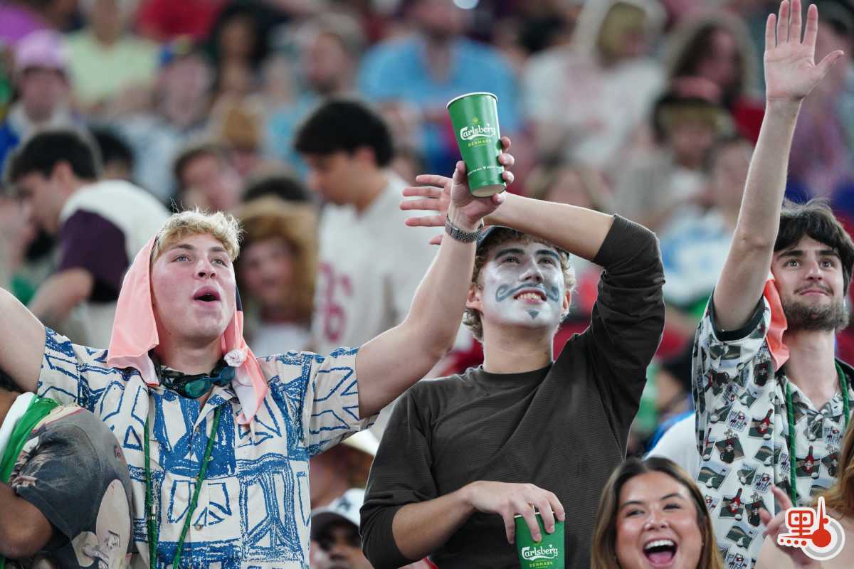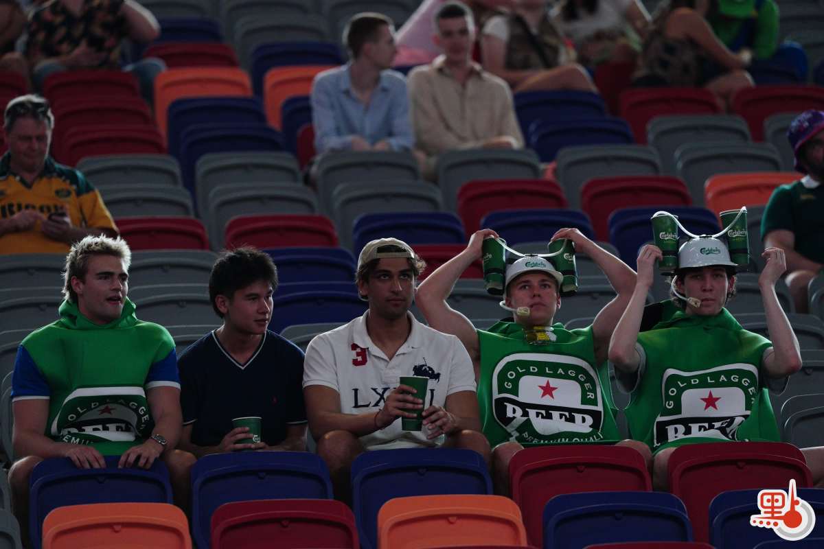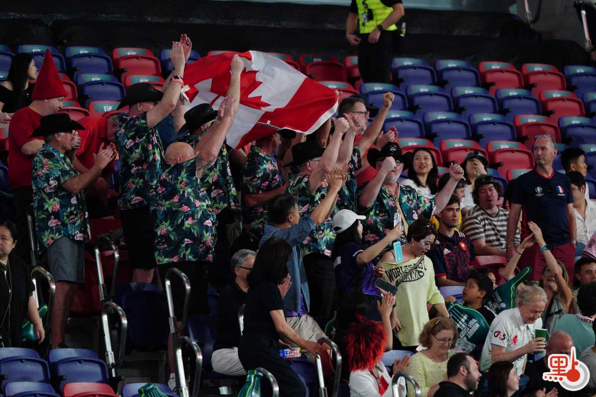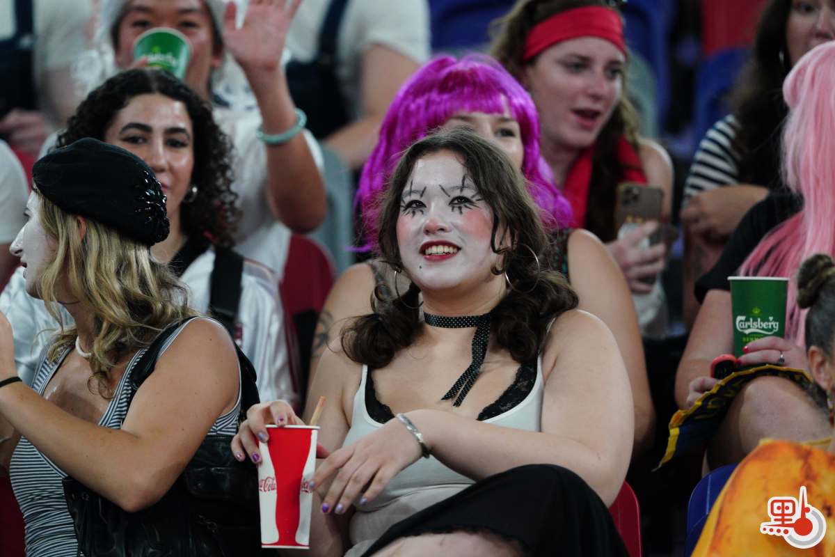 球賽未開打已有熱烈氛圍。國際七人欖球賽的球迷有盛裝打扮、「扮鬼扮馬」的「傳統」,這股氛圍今年同樣席捲啟德。點新聞記者現場所見,不少球迷扮成孖寶兄弟等經典角色,亦有球迷扮成水果、飲料等食物,還有不少球迷穿着「我愛香港(I love HK)」T恤衫。一眾盛裝打扮的球迷更在看台上大合唱,支持球隊,high爆現場!