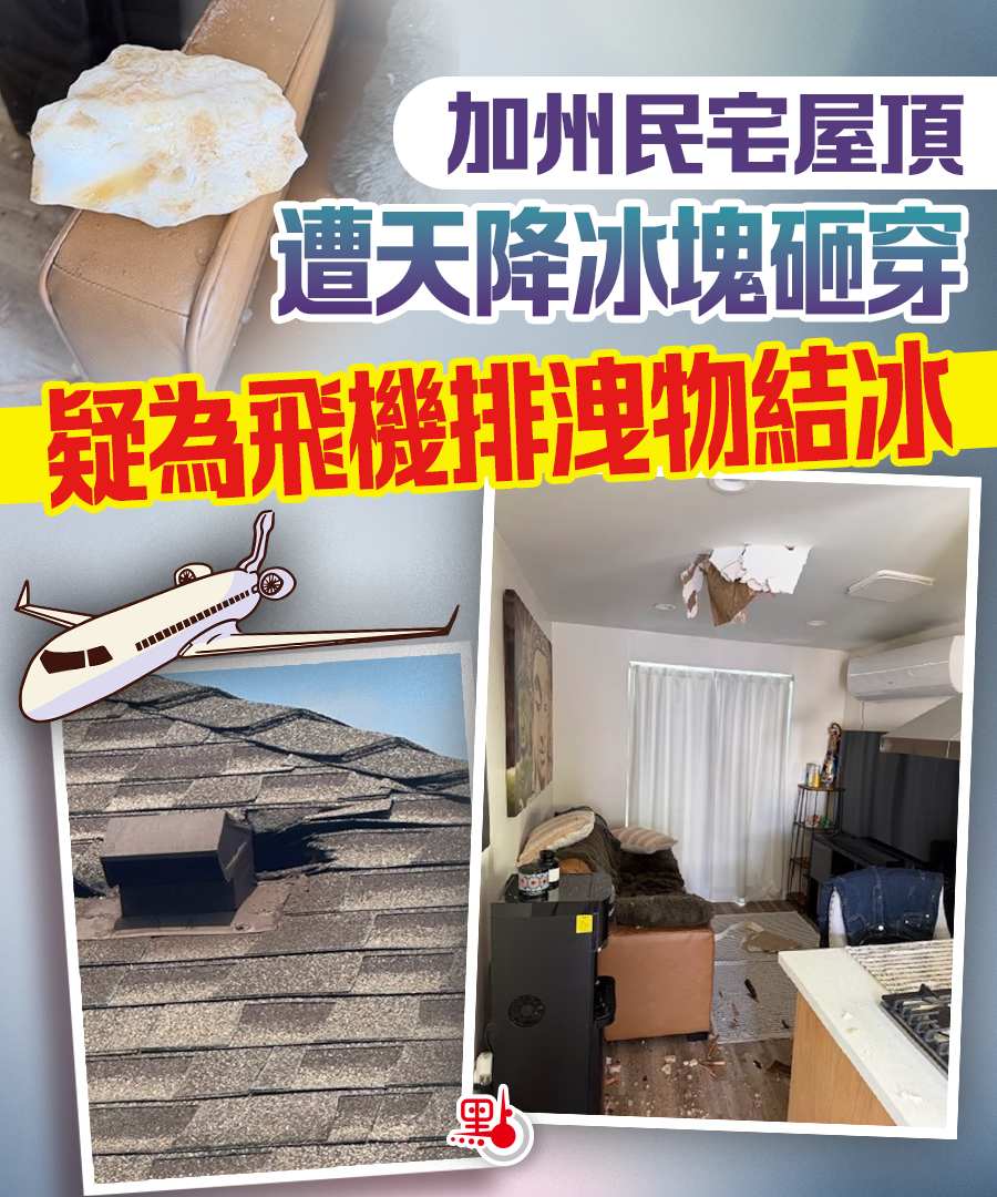 據報道,屋主當時聽見一聲爆炸般巨響,隨後發現一塊骯髒、體積龐大的冰塊穿透屋頂,掉落在客廳梳化上,屋頂及天花板嚴重損毀。