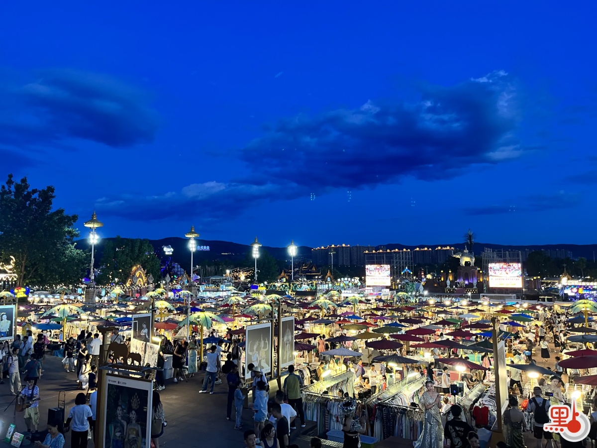 我站在高處,看着星光夜市在腳下慢慢亮起來。夕陽把天邊染成紫紅色,瀾滄江邊的風帶着潮濕的溫度擦過皮膚。夜市的燈同時被打開,好像有人把一盒霓虹顏料灑在河岸:金色大塔的塔尖被打亮,東南亞風格的屋頂被描出輪廓線,街道兩旁密密麻麻的攤位排成一條又一條光帶。