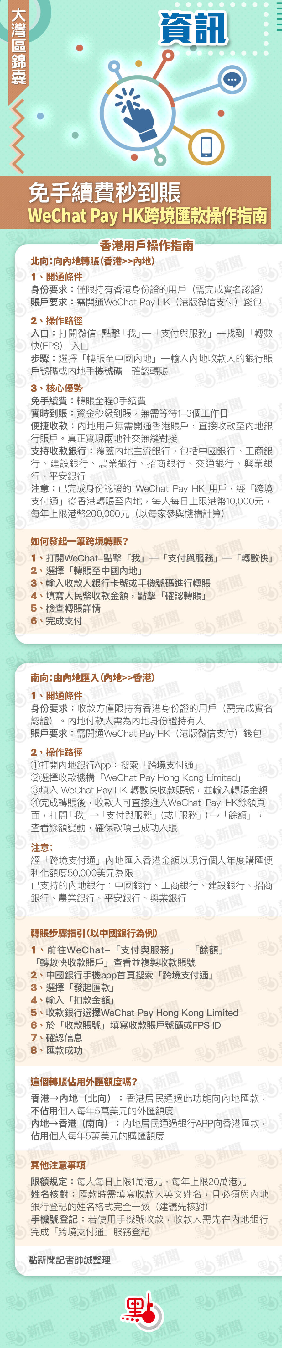 【點新聞報道】日前,WeChat Pay HK(港版微信支付)正式接入「跨境支付通」,香港用戶可免手續費、實時向內地銀行賬戶轉賬,但內地版微信支付(WeChat)目前無法直接使用該功能進行跨境匯款。本期大灣區錦囊整理了「跨境支付通」操作指南,讓你快速了解向內地轉賬和由內地匯入的步驟。