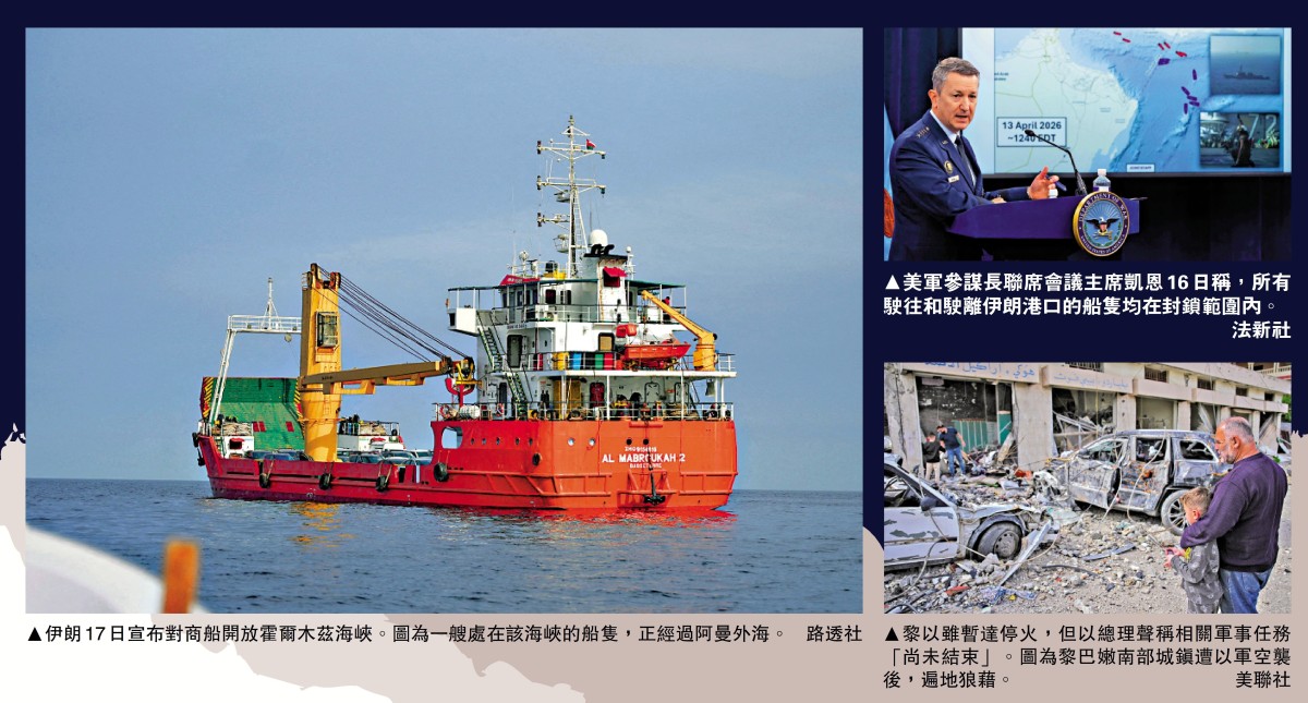 黎巴嫩和以色列達成臨時停火,於當地時間17日零時(本港時間17日早上5時)正式生效,為期10天。伊朗外長阿拉格齊17日稍後在社交媒體宣布,鑒於霍爾木茲海峽在停火期間對所有商船通行完全開放,通行路線依照伊朗港口與海事組織此前已公布的協調路線。特朗普隨後在社媒發帖稱,「伊朗剛剛宣布,伊朗海峽已完全開放,可全面通行。謝謝!」但他隨後揚言,美軍針對伊朗的海上封鎖將繼續有效,直至「我們與伊朗的交易百分之百完成」。外媒認為,所謂「交易」指的就是美伊達成和平協議。