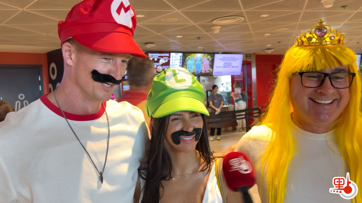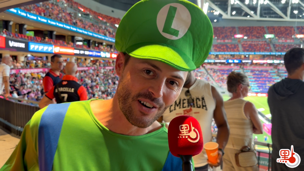 來自南非的Ray生活在愉景灣,今天和妻子帶小朋友一齊來到啟德觀賽,一家人均以「超級瑪利歐」造型出現。「我們很愛香港七欖!」Ray對七欖比賽充滿熱情,表示去年孩子太小,遺憾不能到場觀看,很開心今年可以帶他共同體驗熱鬧氛圍。Ray提到自己和家人都喜歡做運動,他形容香港「非常適合體育」,稱讚這裏充滿活力、運動氛圍濃厚,未來還會在港觀看各類賽事。