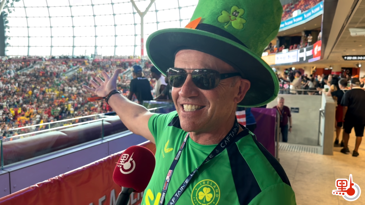 Jim來自愛爾蘭,今次專程來港觀看七欖。「今天是『奇裝異服日』。」Jim介紹,將自己扮得古靈精怪是觀看七欖的傳統之一,他今日便和幾位好友身穿同款綠色T恤、搭配愛爾蘭小矮妖禮帽,一齊到場支持斐濟隊。首次來港的Jim對啟德主場館讚不絕口,表示在這裏玩得非常開心,計劃明年還要再來觀看比賽。