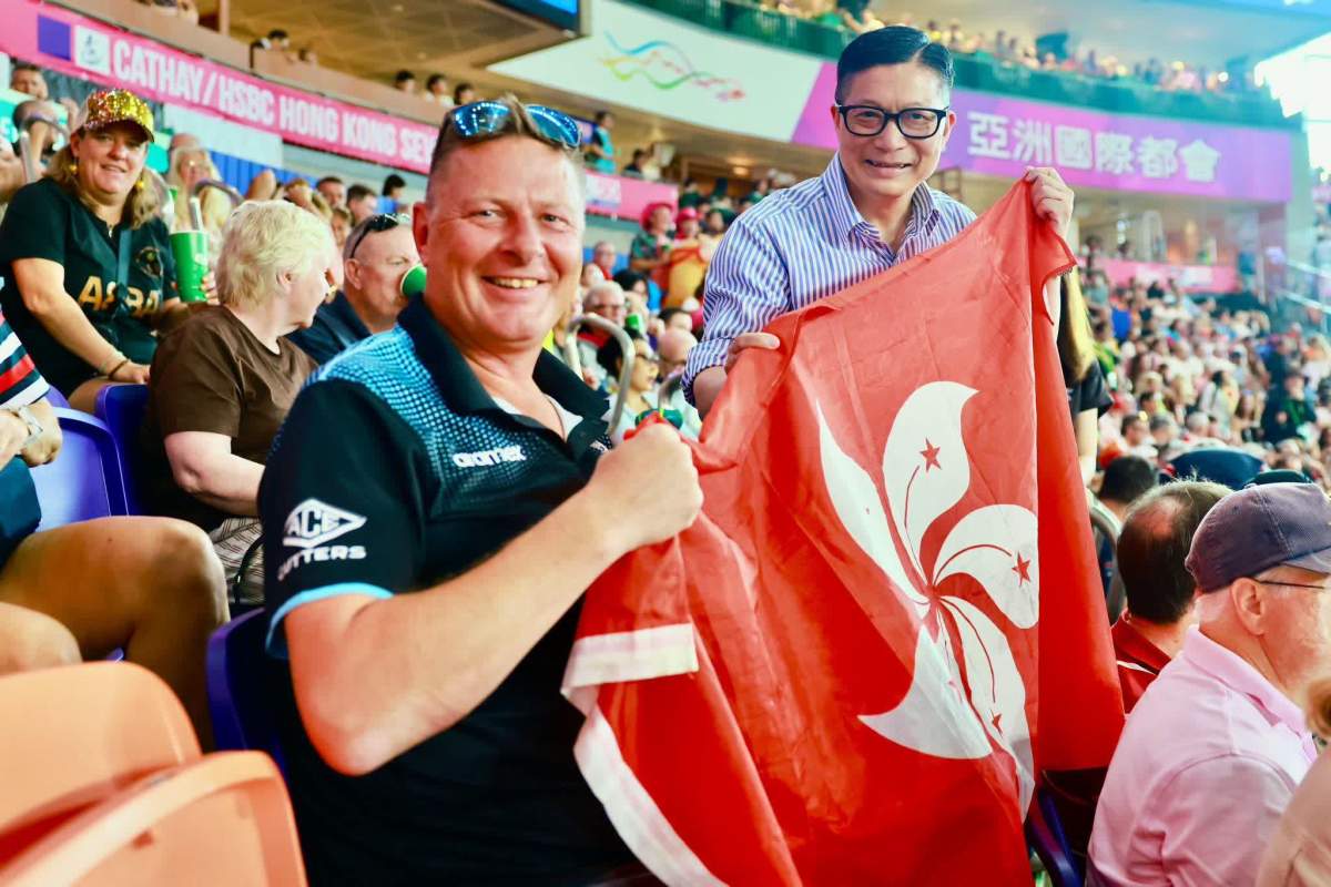 【點新聞報道】香港國際七人欖球賽今日(18日)進行第二天賽事,球迷必爭之地南看台爆滿,要實施人流管制。期間,保安局局長鄧炳強到場視察人流管理和維持秩序的情況,又走入南看台與球迷交流和合照,親身支持該項年度盛事。