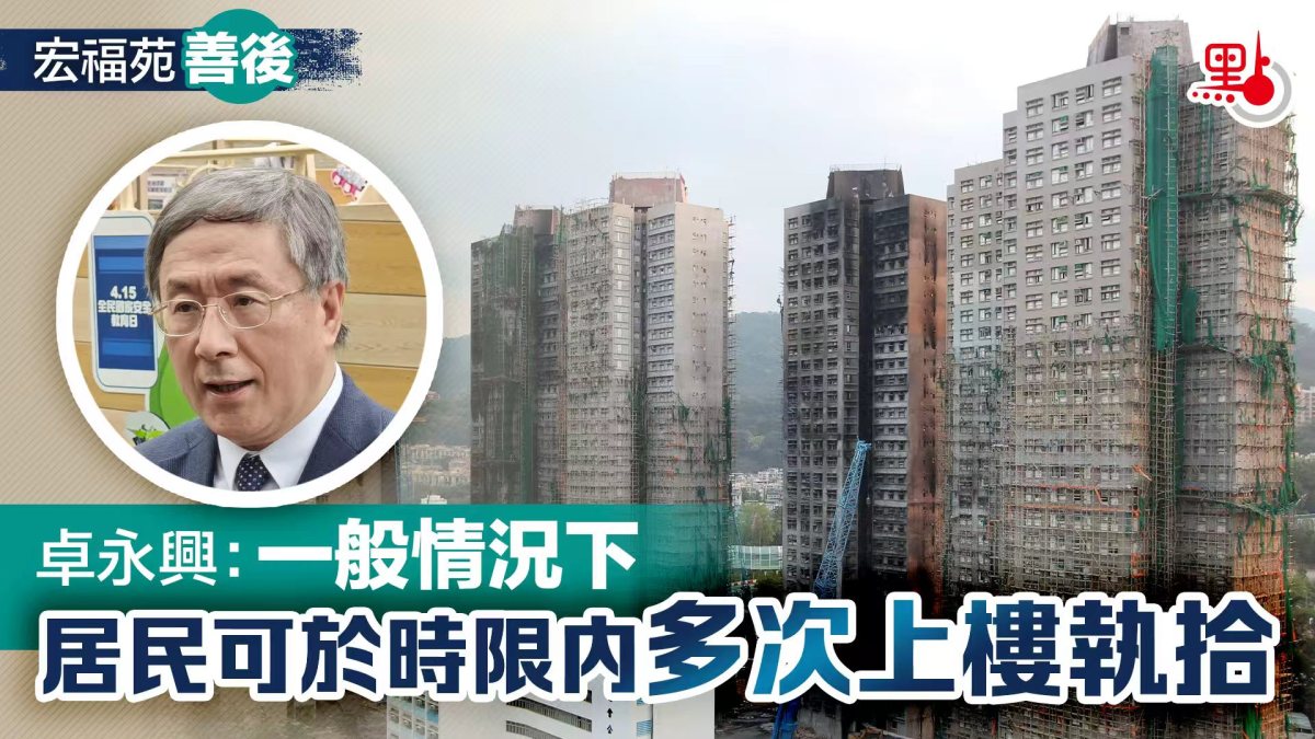 【點新聞報道】大埔宏福苑7座受災大廈住戶,明日(4月20日)起可按當局安排的時段上樓執拾,首批開放宏新閣,每戶可上樓3小時。政務司副司長卓永興提到,留意到不少居民希望上樓多於一次,經再次評估後,當局認為在一般情況下,如有需要,可容許居民在3小時内上落樓多於一次。