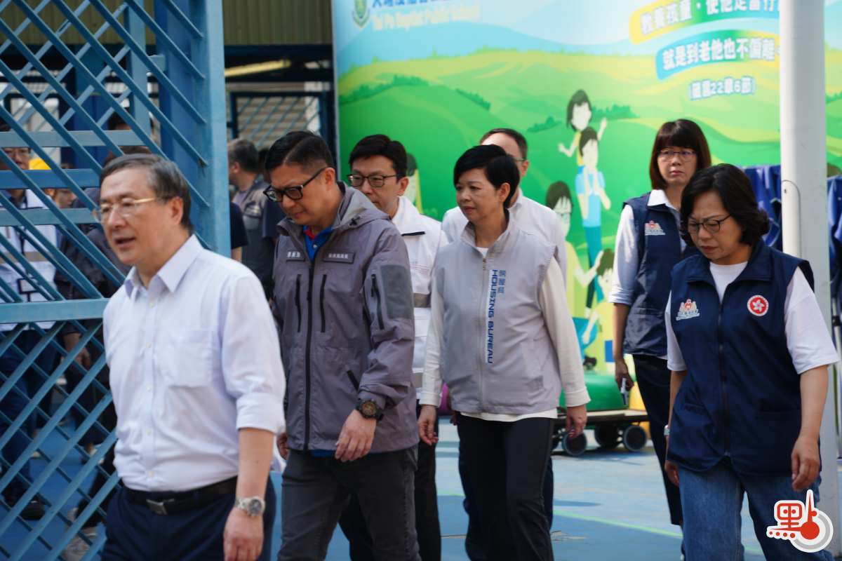 【點新聞報道】今日(20日)起至5月4日,由宏新閣開始,大埔宏福苑受災的7座大廈居民可以分批上樓執拾物品。政務司副司長卓永興、保安局局長鄧炳強、房屋局局長何永賢、民政及青年事務局局長麥美娟和勞工及福利局局長孫玉菡今早視察上樓安排的準備情況後見記者。