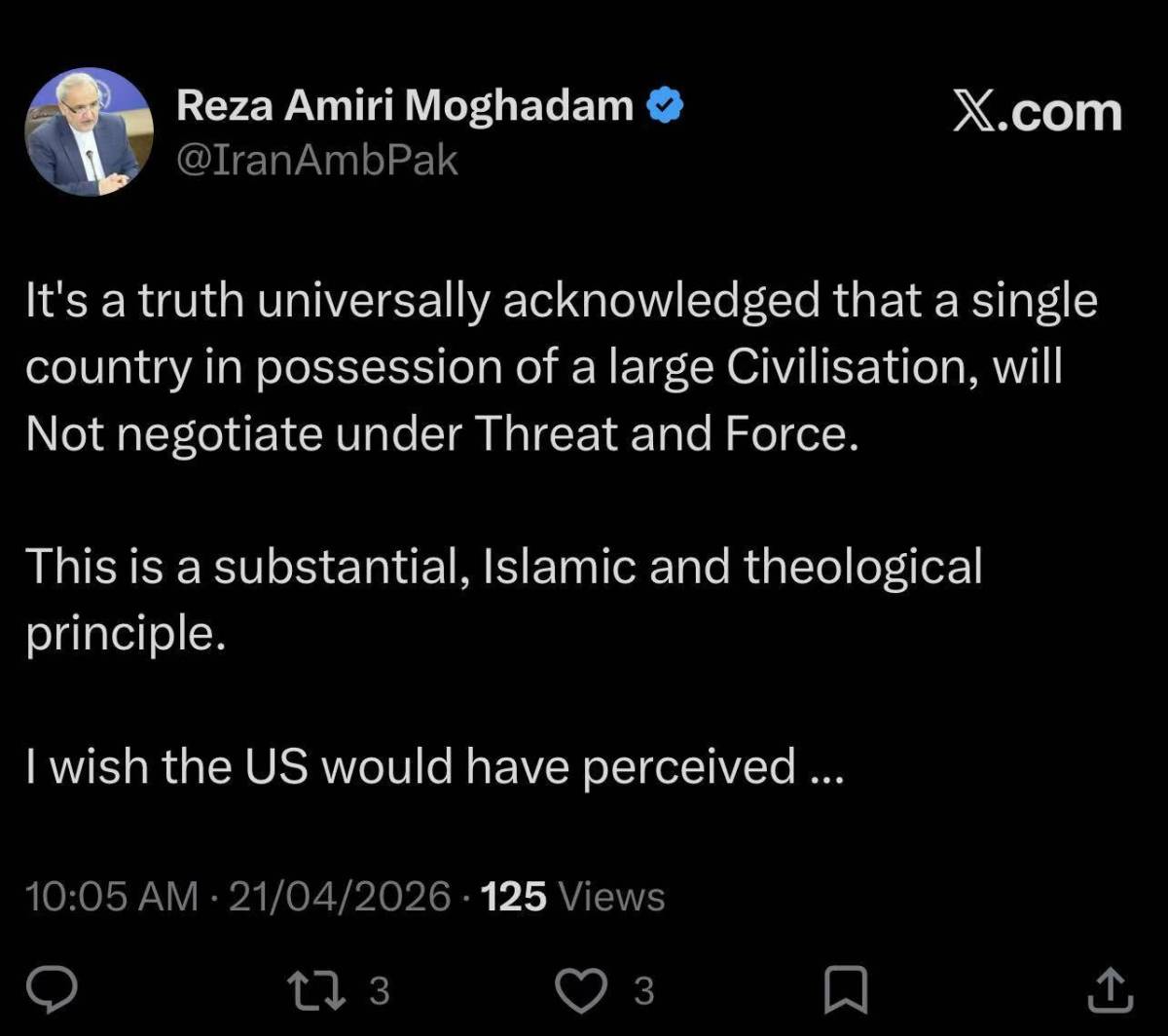 當地時間4月21日,伊朗駐巴基斯坦大使穆加達姆在社交平台發文表示,一個擁有龐大文明的國家,絕不會屈服於威脅和武力進行談判,這是舉世公認的真理。美國本應意識到這一點。