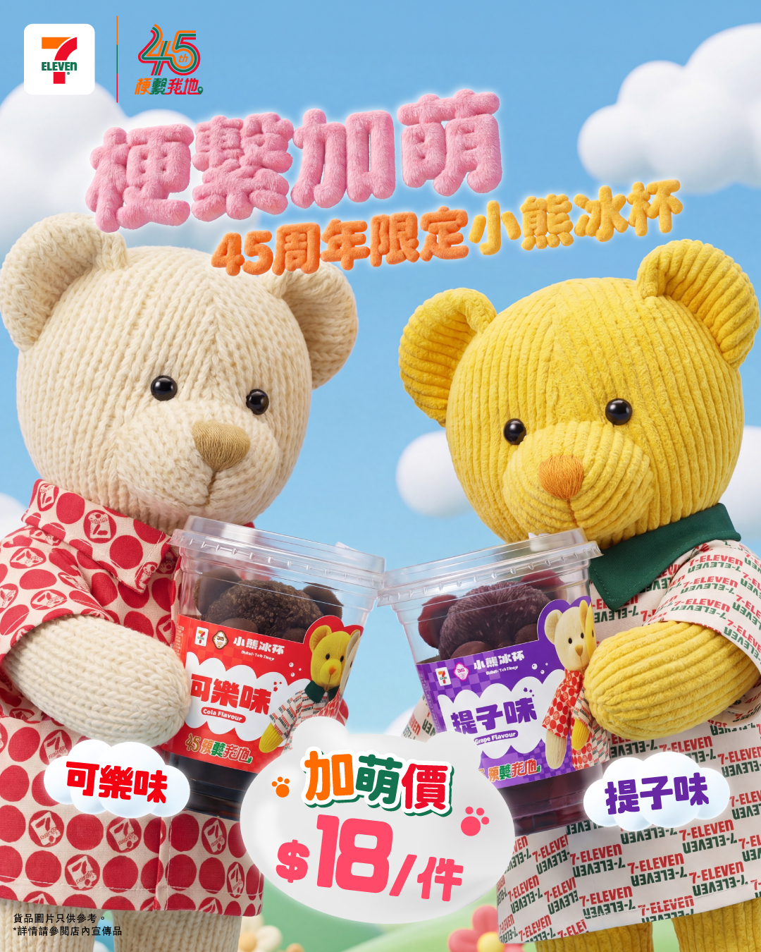 經典角色Sunny & Rainbow限定小熊冰杯($18/件)。由4月22日至5月5日到7-Eleven買45周年限定小熊冰杯,加$3即可換購可口可樂/無糖可口可樂/雪碧/芬達/玉泉330毫升1罐。