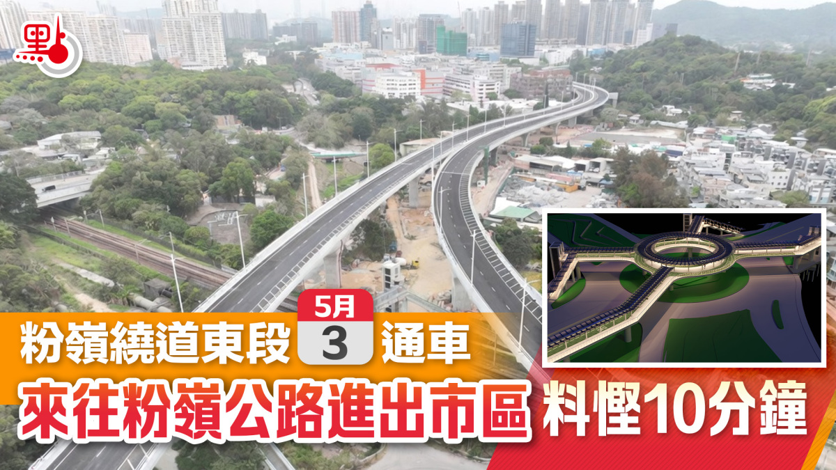【點新聞報道】政府今日(21日)公布,粉嶺繞道(東段)將於5月3日(星期日)上午8時通車。繞道通車後,駕駛人士可取道新路線來往粉嶺龍躍頭、聯和墟及粉嶺公路,無須途經上水及粉嶺市中心的繁忙道路,在繁忙時段可節省約10分鐘車程。