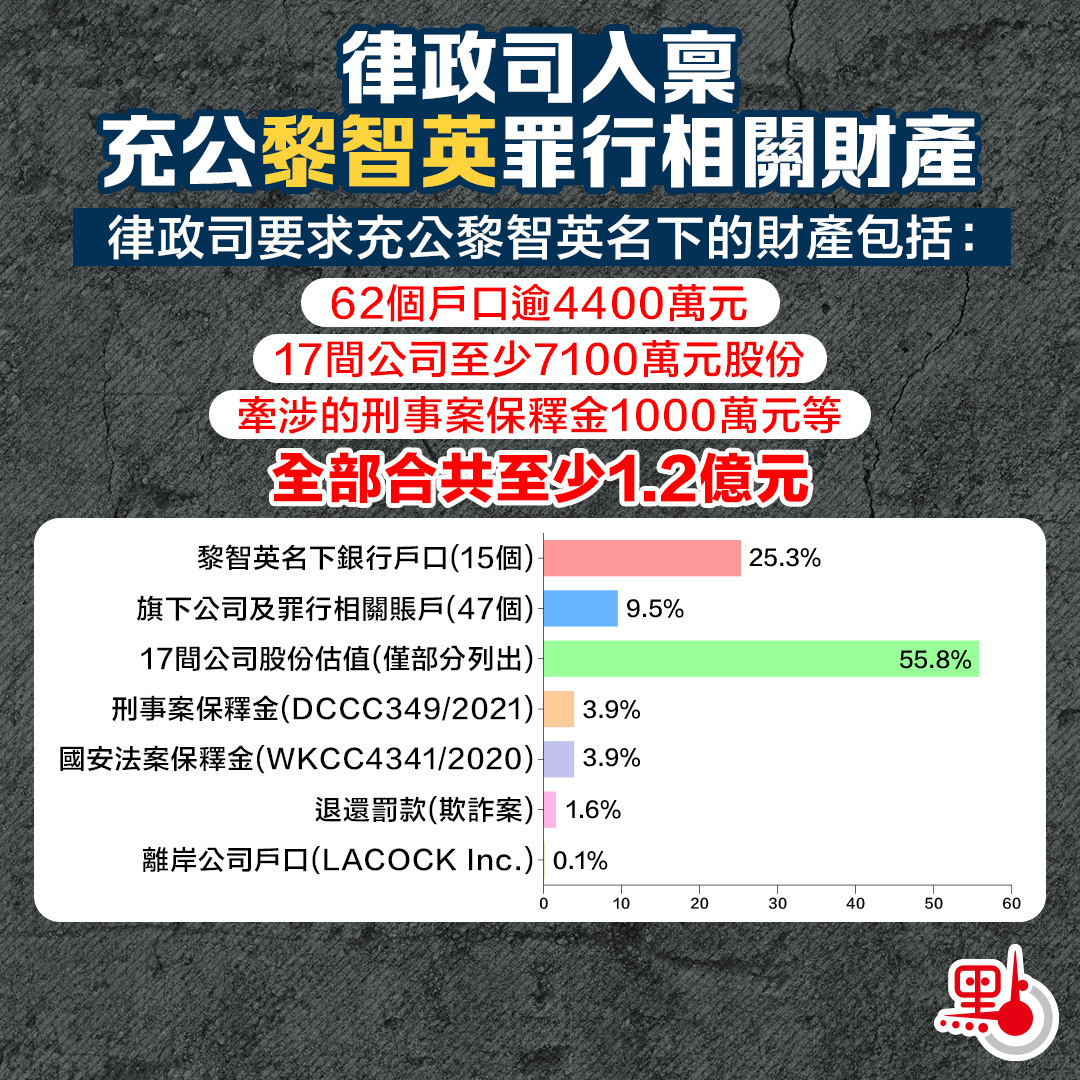 入稟狀有列出黎智英持股的名下17間公司,包括Dico Consultants Limited (黎智英持股50%)、Best Combo Limited 、Absolute Ace Limited、Sino Focus Group Limited 、Billion Flower Limited(黎智英持股50%)、AD Marketing Limited (黎智英持股50%)、adMart eZone Limited(黎智英持股99%)、eZ Van Limited (黎智英持股50%)、Next Animation Studio Limited 、Ally Glory Investments Limited 、Fog City Digital Limited 、Chartwell Holding Limited 、Lai』s Hotel Properties Limited (黎智英持股100%)、Comitex Holdings Limited 、Comitex Knitters Limited、Firm Way Investments Limited(黎智英持股33.3%、黎智英長子黎見恩持股33.3%),以及黎智英持股71.26%的壹傳媒有限公司(Next Digital Limited)。