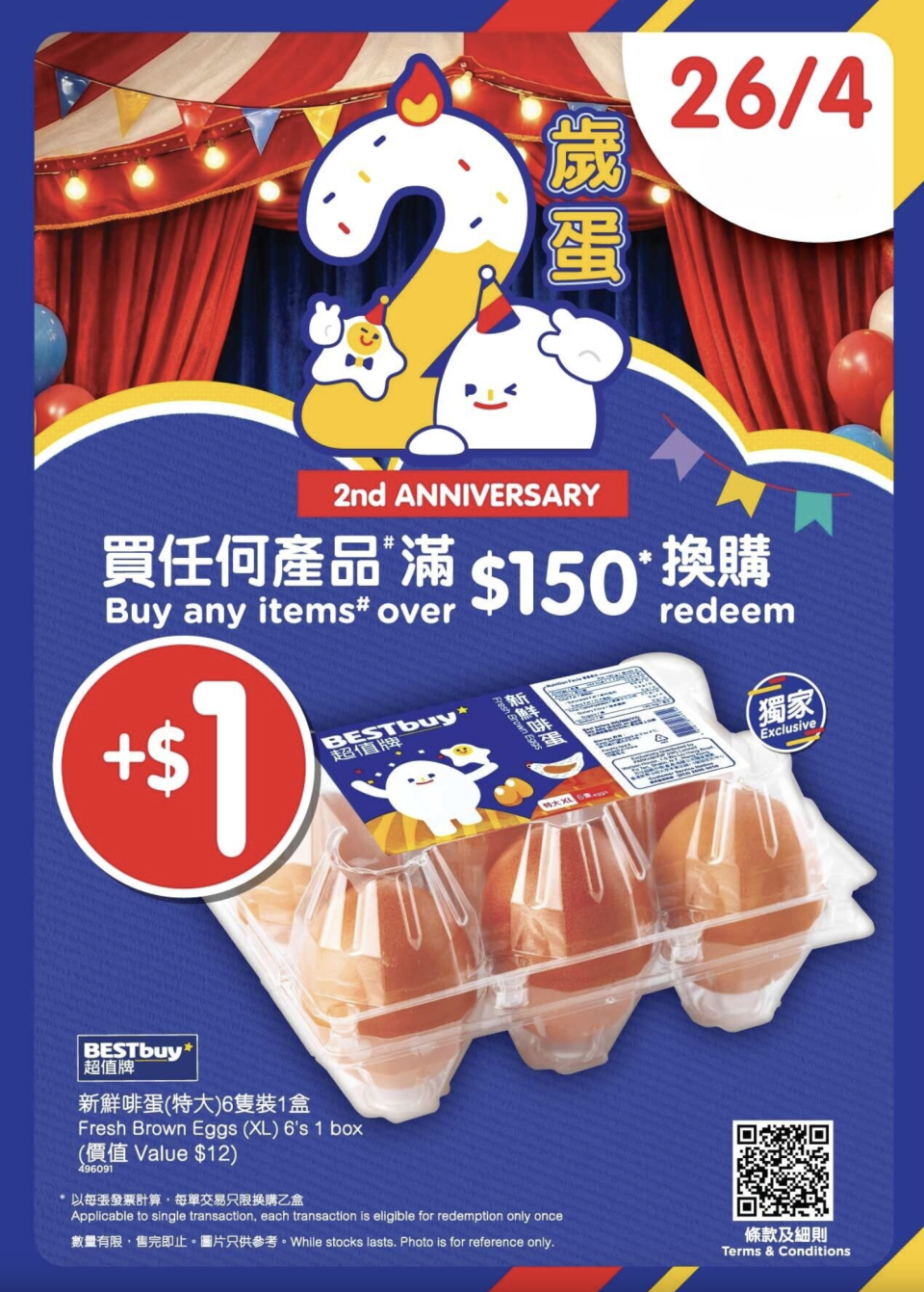 百佳於4月26日「佳蛋仔」及「百便星」生日當天,推出「$1換購特大啡蛋」活動,凡於香港百佳及旗下門市(GREAT FOOD HALL及FOOD PARC除外)或PNS網購購物滿$150,即可加$1換購1盒6隻超值牌新鮮啡蛋特大裝(價值$12),限量25000盒,換完即止。