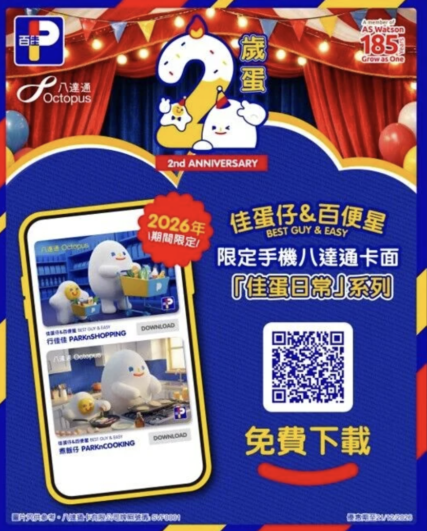 由即日起至2026年12月31日,大受歡迎的「佳蛋仔」及「百便星」手機八達通卡面驚喜回歸,免費帶來兩款全新卡面「佳蛋仔&百便星–佳蛋日常」,立即下載,為八達通換上最愛的卡面設計。