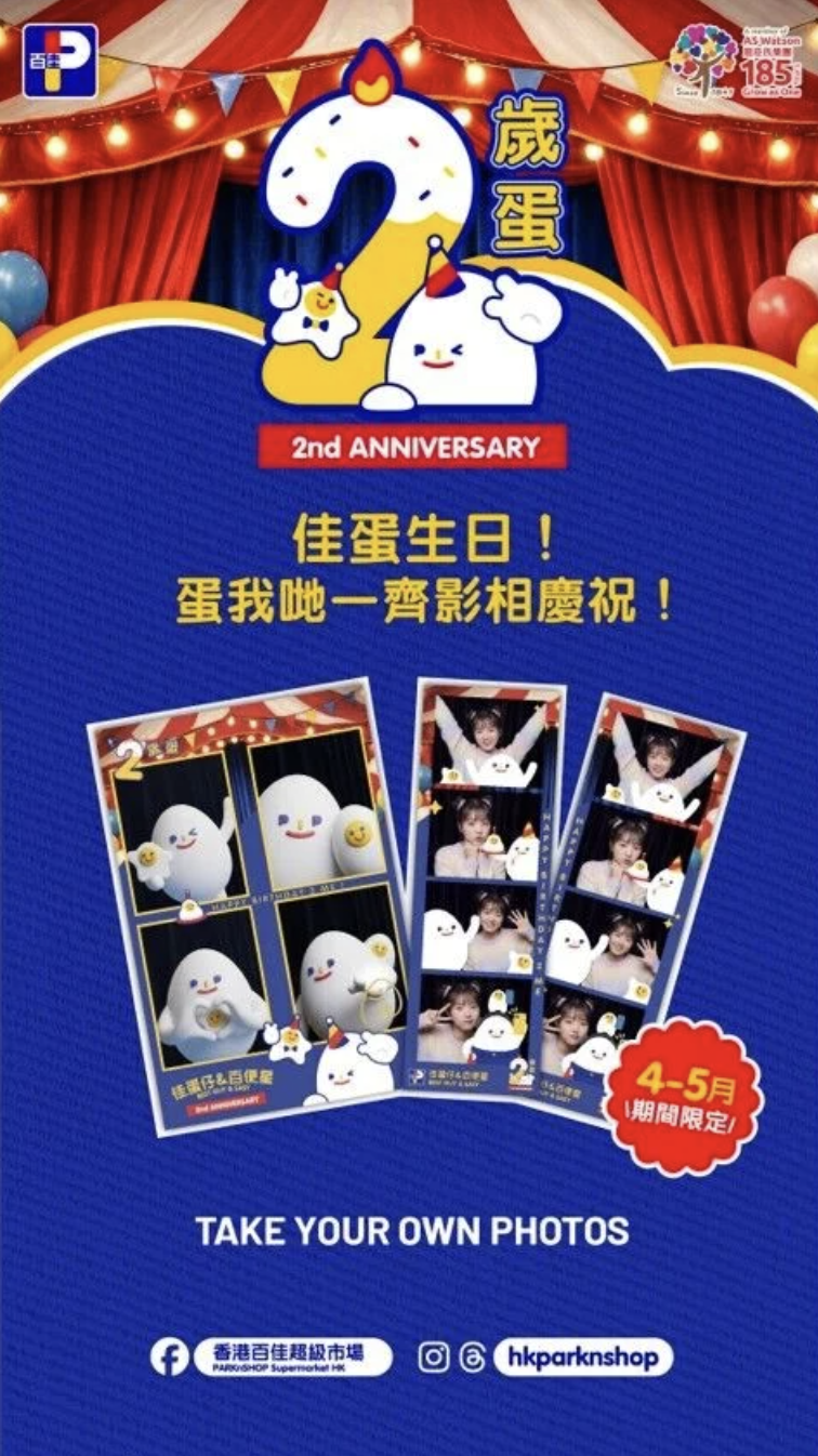 4月25日起,百佳推出超市首創的自拍機,更特別製作兩款「佳蛋仔」限定相框,讓大家輕鬆拍出玩味十足的「人生四格」,與2歲「佳蛋」留下不一樣的紀念回憶。