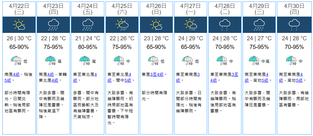 天文台指,一股偏南氣流正影響廣東沿岸,本港地區今日(4月22日)部分時間有陽光,日間炎熱,稍後局部地區有驟雨;而位於華南北部的低壓槽已發展為一道冷鋒,並預料會在明日(4月23日)橫過沿岸地區。根據天文台最新一報,料明日天氣漸轉不穩定,有驟雨及狂風雷暴,稍後氣溫下降;星期五(4月24日)部分地區雨勢較大,最低氣溫在21度左右;星期六(4月25日)早上天氣仍然稍涼,驟雨逐漸減少。隨着高空擾動遠離,下周初廣東沿岸天色稍為好轉。