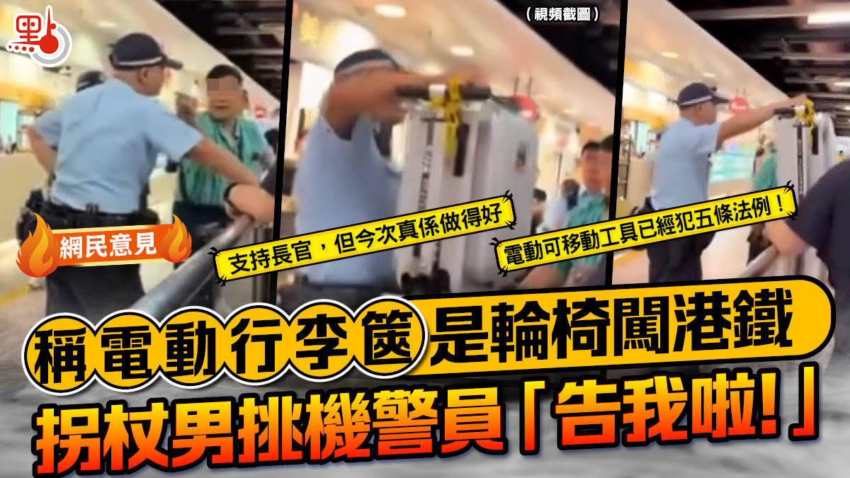 【點新聞報道】網上近日瘋傳一段影片,可見一名男子攜帶電動行李篋在一港鐵站內,被多名職員及警員截停。男子聲稱行李篋是「輪椅」,遭警員當場駁斥「呢個唔係輪椅!」,男子隨即改口指是「拖篋」,並叫警員「唔啱咪告我啦」。事件引發熱議,不少網民支持警員執法。