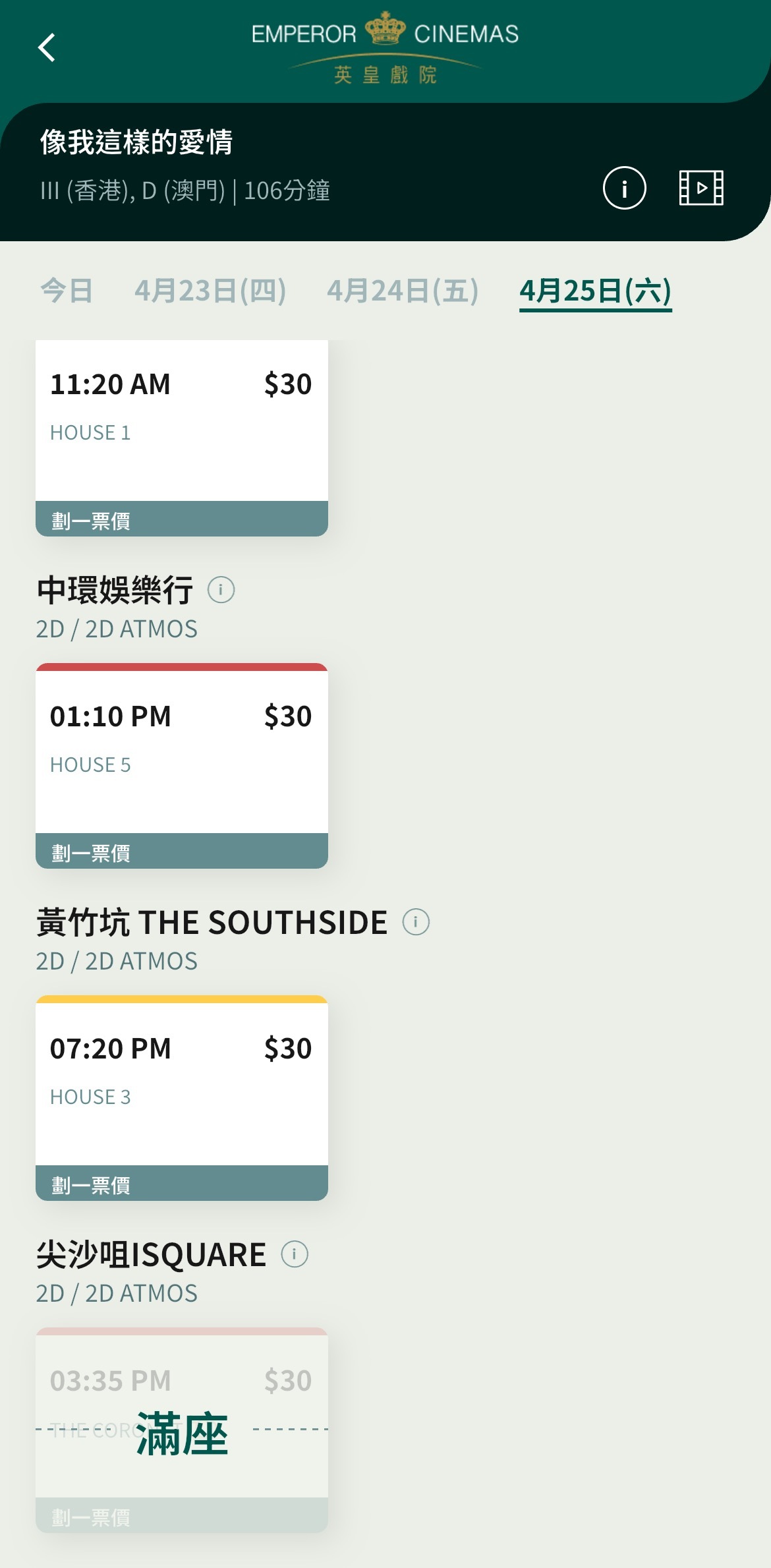 至於其他熱門電影,如由剛剛斬獲香港金像獎影后廖子妤主演的《像我這樣的愛情》,4月25日英皇戲院設8個場次,當中尖沙咀ISQUARE已告滿座,大圍圍方、中環娛樂行亦已爆滿;《末日聖母號》則所有場次爆滿,當中中環娛樂行已告滿座。