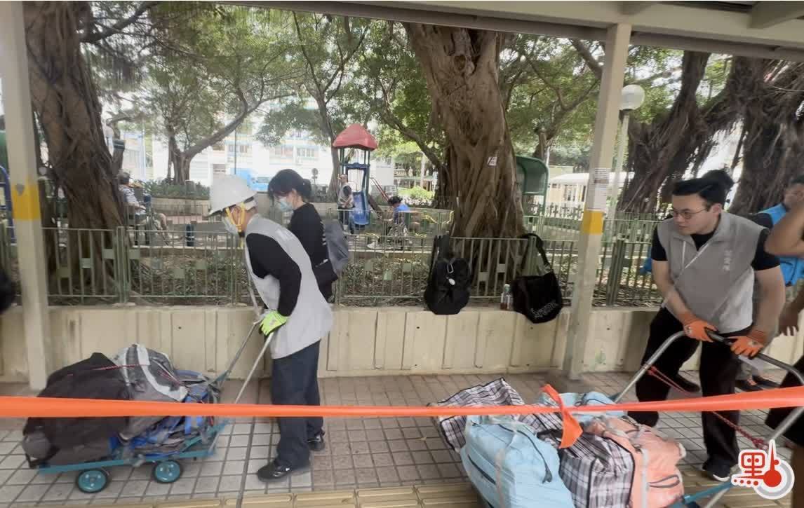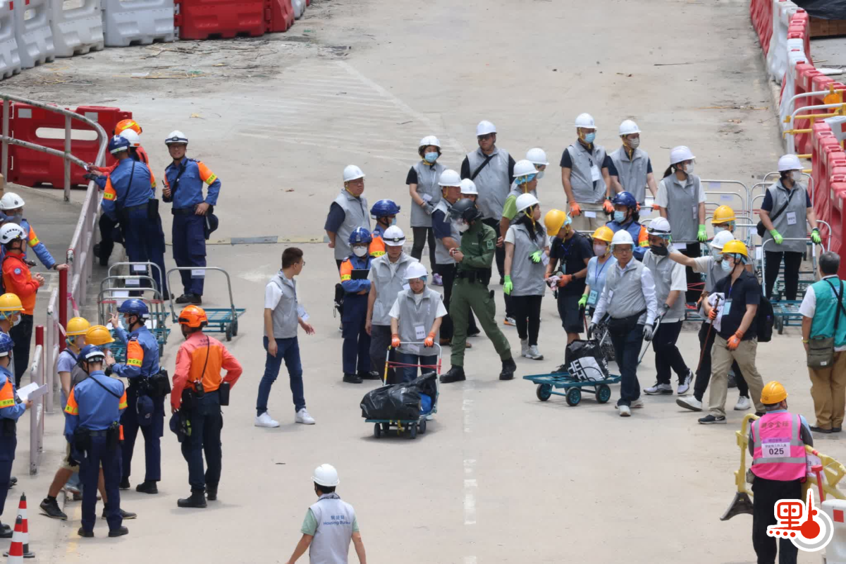 【點新聞報道】大埔宏福苑七座大廈受災居民自4月20日起分批重返單位執拾物品。今日(22日)進入第三日,輪到宏新閣20至31樓的高層住戶上樓。隨着時間接近中午,點新聞記者現場所見關愛隊成員手持手拉車,幫助居民將行李從樓上運下來;社署人員忙於運送飯盒;民安隊也在場協助。有居民讚揚政府安排「真係不錯」,人手十分充足,形容整個執嘢過程「比預想舒服」。