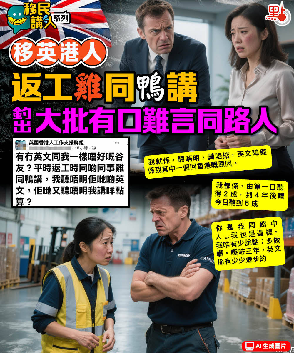 【點新聞報道】不少港人無能力、英文都唔識,但又要學人移民英國,去到才發覺係工作生活都困難重重。有移英港人發文圍爐訴苦,話「平時返工時同啲同事雞同鴨講」,結果釣出不少有口難言的同路人。