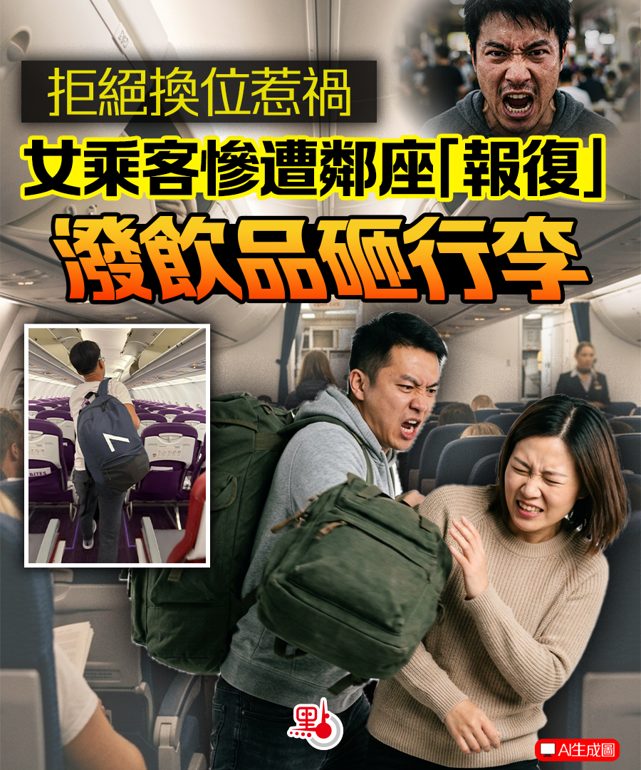 然而等樓主坐下後,發現旁邊的男乘客突然大力撞擊自己右臂,之後更趁自己睡覺時「用嘢飲倒落我件衫,叫醒我話知你睇下你件衫」。樓主憤怒下立即要求空少調位,空少給她紙巾清理,並調到後面一排的座位。不過樓主表示,該男乘客未有罷休,再用背囊及行李「飛落我度,扮唔小心」。