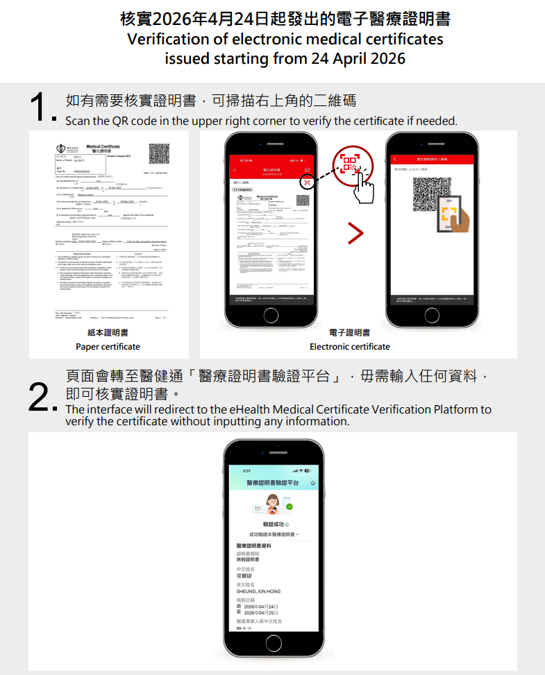 【點新聞報道】繼電子醫生證明書(俗稱「病假紙」)及電子應診證明書後,由明日(4月24日)起,醫管局發出的產/病假證明書及產假證明書亦會採用電子簽署及設有電子版本,取代傳統的人手簽署紙本證明書。換言之,所有由醫管局發出的病假、產假和應診醫療證明書已全面數碼化。