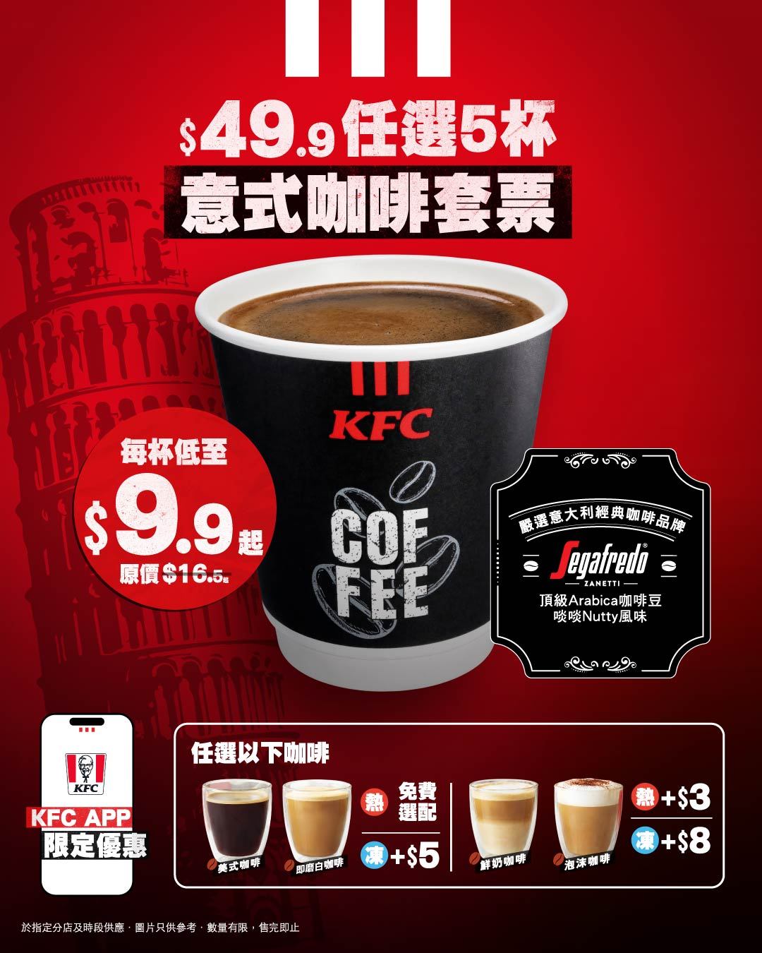【點新聞報道】由即日起至5月13日,肯德基(KFC)推出「意式咖啡優惠券套票」,5杯意式咖啡只需$49.9,每杯平均低至$9.9,全日任何時段都可以兌換。