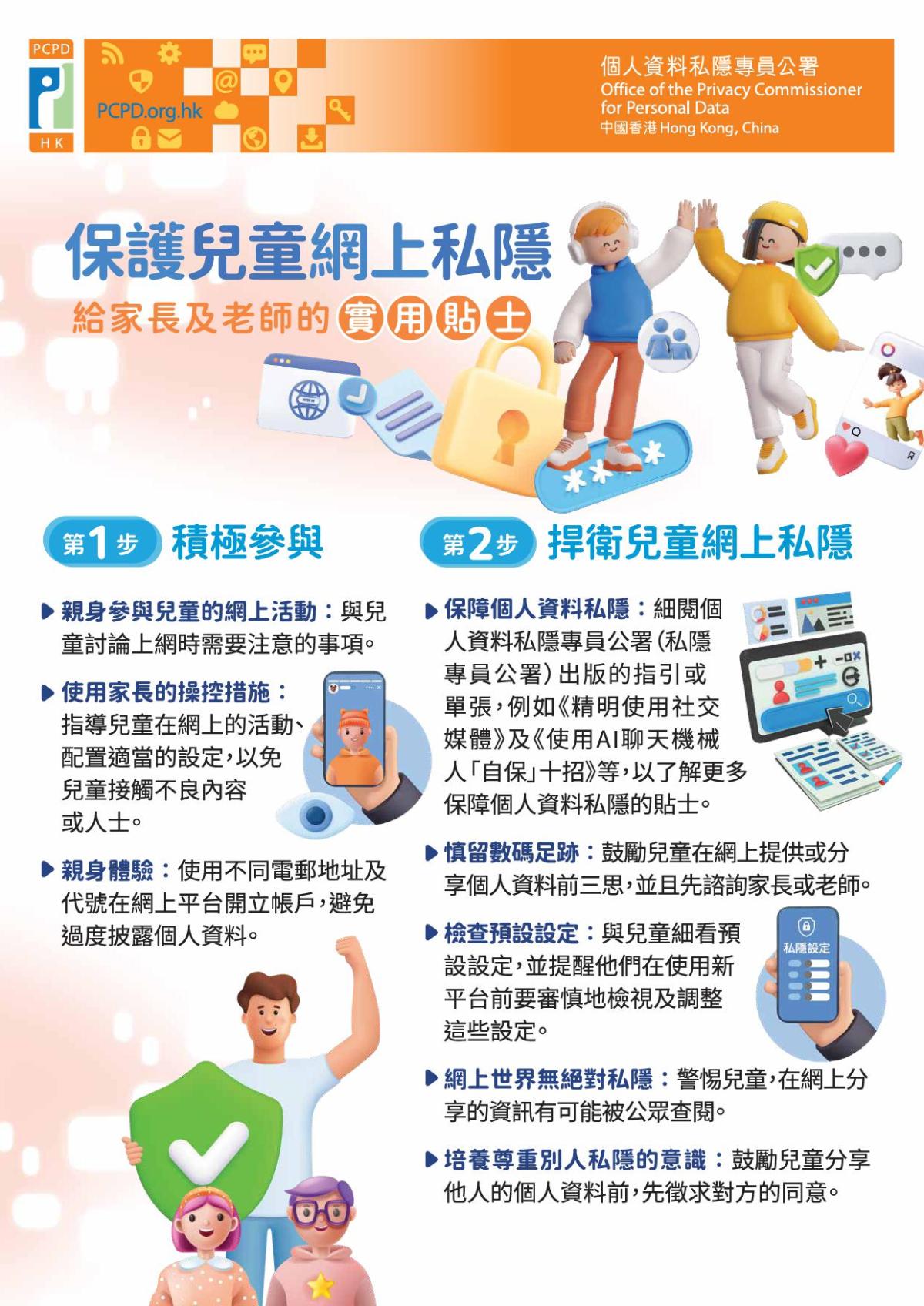 《貼士》就家長及老師如何引導兒童保障其網上個人資料私隱提供多項實用建議,重點包括:
