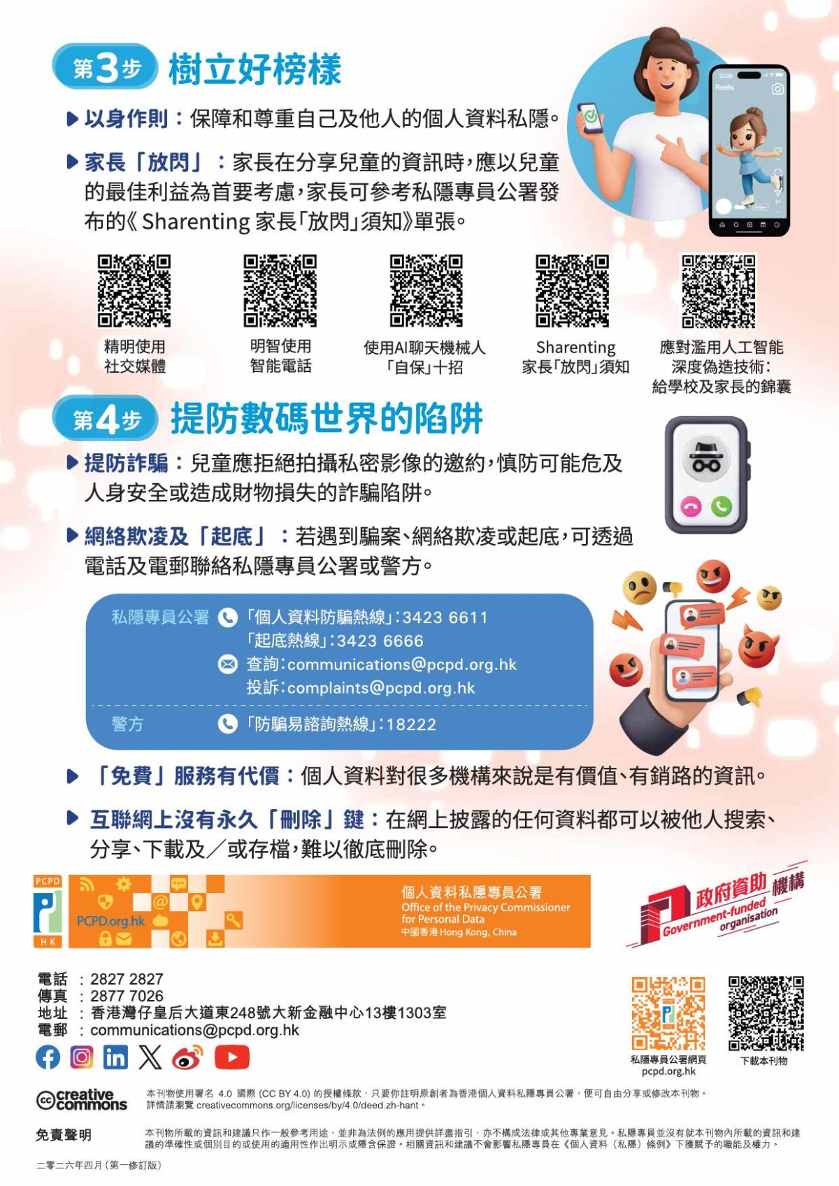 - 提醒兒童數碼世界的陷阱:家長及老師應警惕兒童有關網上詐騙、網絡欺凌、人工智能深度偽造技術的濫用及「起底」等風險,並提醒兒童他們的個人資料對不少機構而言是有價值、有銷路的資訊;以個人資料換取看來是「免費」的服務未必划算;以及互聯網上沒有永久「刪除」鍵。