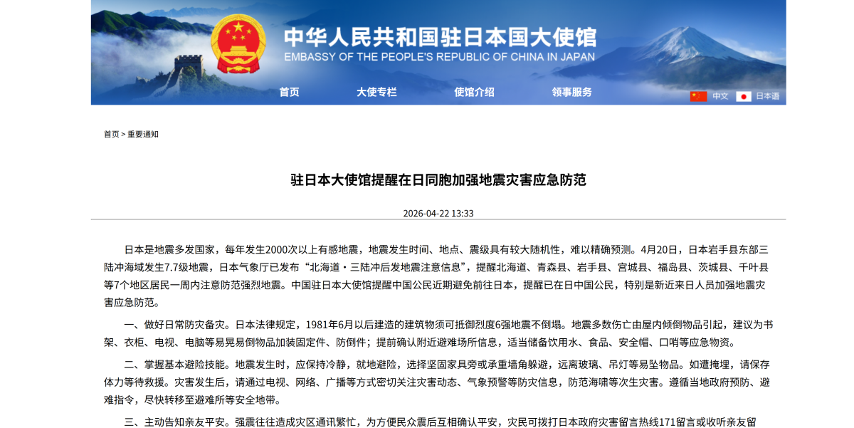 【點新聞報道】中國駐日本大使館4月22日消息,駐日本大使館提醒在日同胞加強地震災害應急防範: