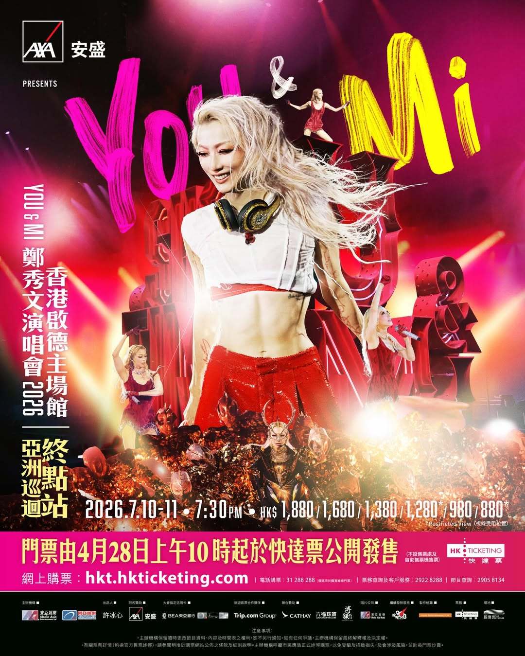 【點新聞報道】天后鄭秀文(Sammi)將在7月10日至11日舉行《You & Mi鄭秀文演唱會2026亞洲巡迴終點站-香港啟德主場館》,4月20日信用卡優先購及今日(23日)Trip.com優先訂票均被秒殺。主辦方宣布,演唱會將於4月28日上午10時起於快達票公開發售,門票票價為$1880、$1680、$1380、$1280(視線受阻位置)、$980、$880(視線受阻位置),粉絲們可以集結買飛喇!
