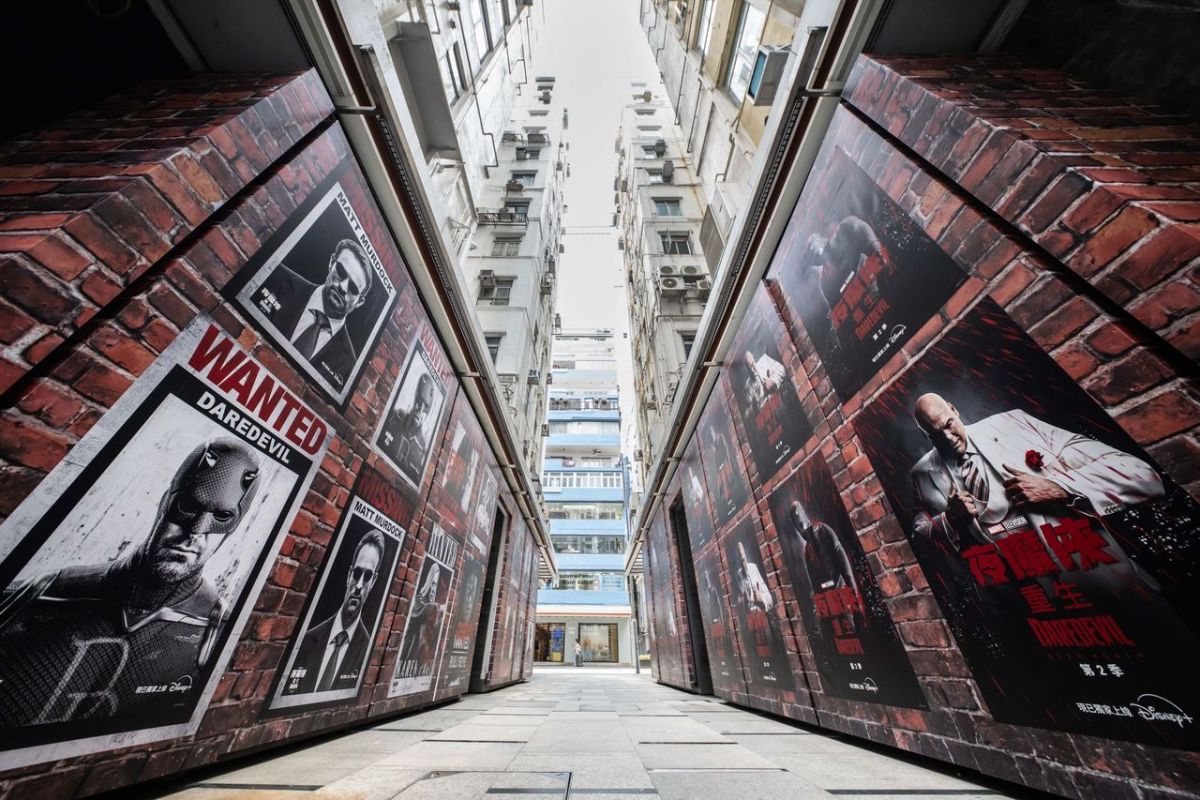 劇中夜魔俠經常穿梭橫街窄巷懲惡揚善,為逃避金霸王及反義警特遣隊的追緝而四處閃躲。為了讓大家走入夜魔俠的世界,即日起至5月20日,Disney+聯手銅鑼灣Fashion Walk將兩幅巨型牆壁搖身變成紐約街頭的紅磚牆,再貼上極具街頭風的通緝海報,壓迫感十足!