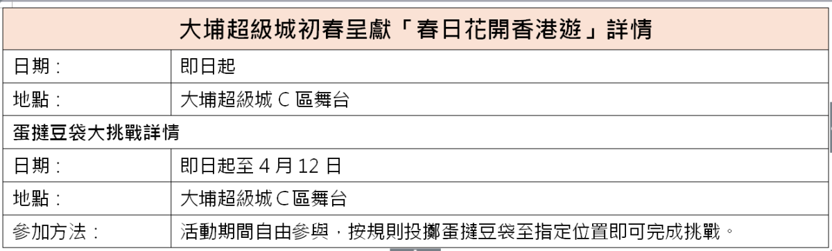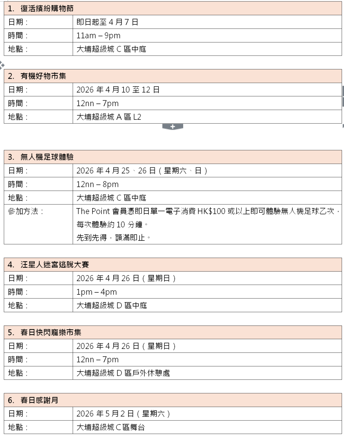 於「春日花開香港遊」期間,大埔超級城將會舉行一系列多元化活動,橫跨4、5月整個春季!其中包括: