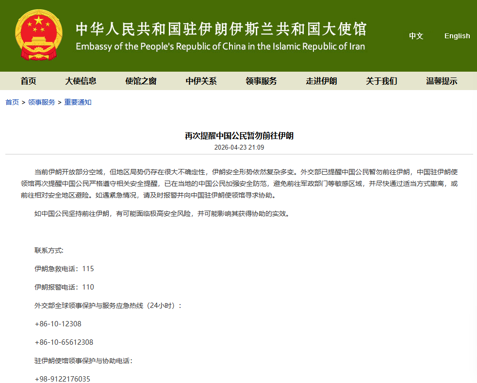 【點新聞報道】4月23日,中國駐伊朗大使館提醒中國公民暫勿前往伊朗。當前伊朗開放部分空域,但地區局勢仍存在很大不確定性,伊朗安全形勢依然複雜多變。
