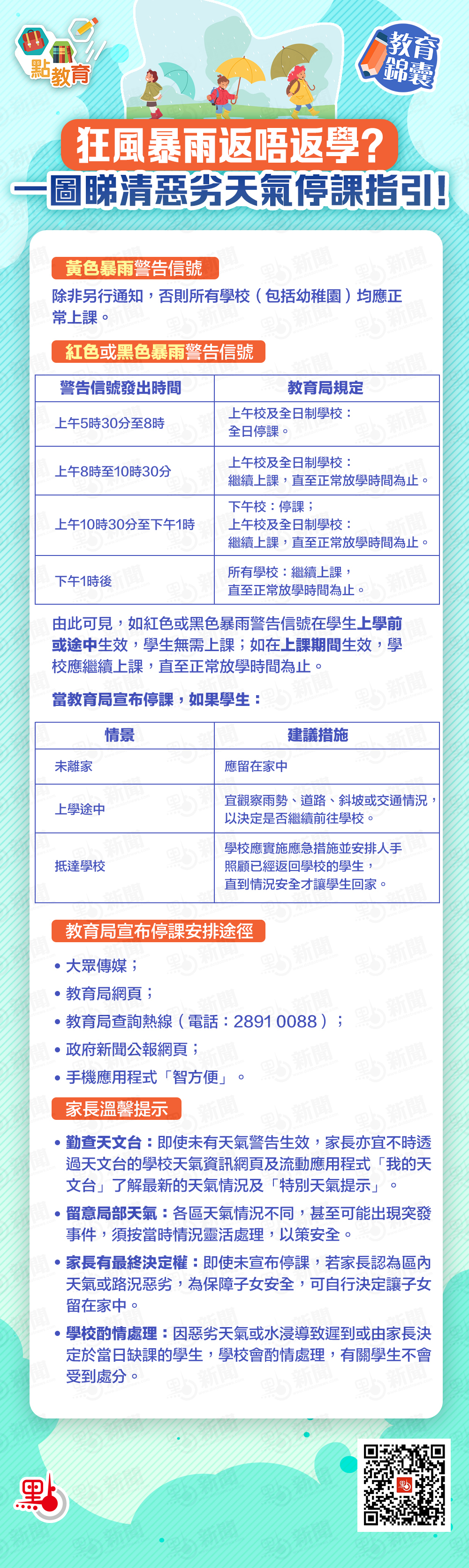 【點新聞報道】一覺醒來窗外狂風暴雨,該不該讓子女上學呢?據天文台報道,一道冷鋒正橫過廣東沿岸,給香港帶來驟雨。教育局已提前發布關於停課指引的「家長電子專遞」,點教育綜合相關信息,為家長解答疑惑。