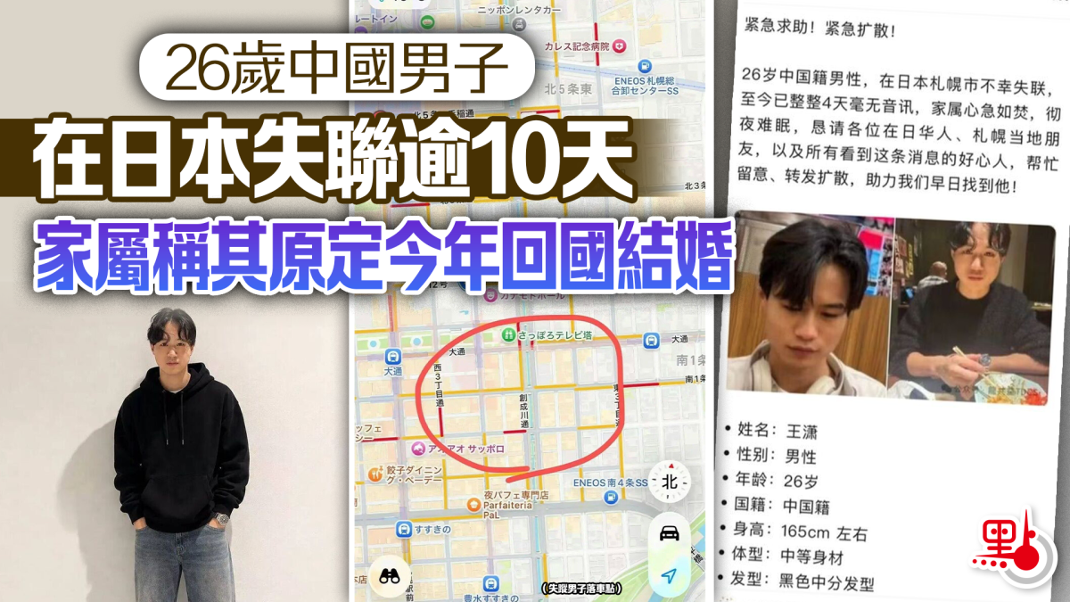據內地媒體《極目新聞》報道,據尋人啟事信息顯示,失蹤者名為王瀟,身高165cm,中等身材,髮型為黑色中分,於2026年4月11日23時30分左右,在日本札幌市參加完朋友聚會後,獨自乘坐的士離開,此後便徹底失去聯繫。自失聯後,其從未前往公司上班,手機始終處於無法接通狀態,家屬完全聯繫不上。王瀟於日本的女友翌日(12日)向日本警方報案,並聯繫中國駐札幌總領事館求助。