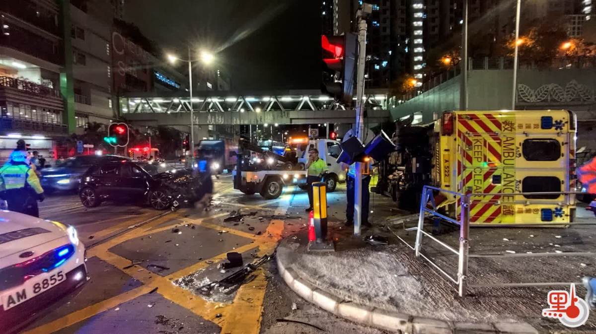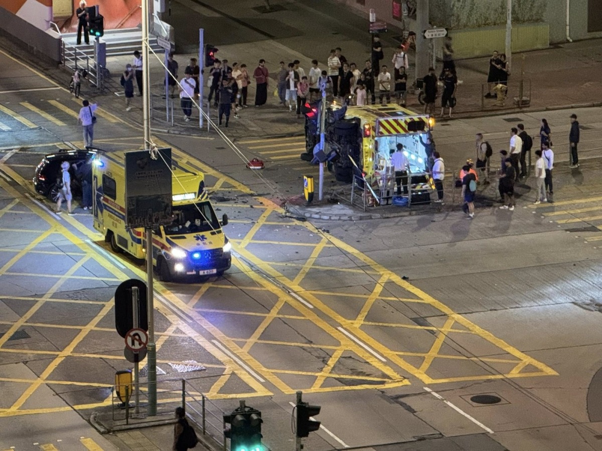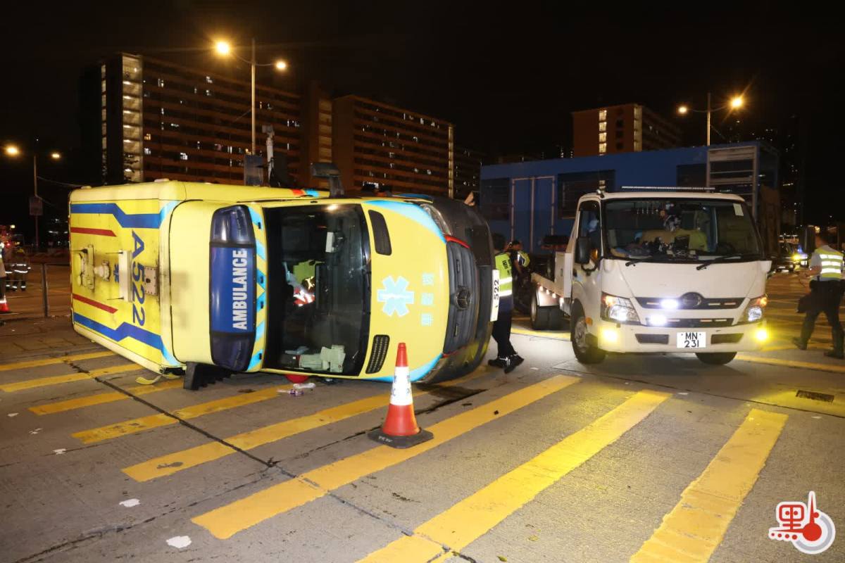 事發昨晚11時許,一輛接獲緊急服務消防處救護車(編號A522)沿東京街第3線駛至長沙灣道交界時,與一輛沿長沙灣道南行駛私家車相撞,救護車被撞至向右翻側,車身壓向安全島的圍欄,私家車的車頭嚴重損毀,途人見狀報案求助。根據網上圖片可見,多名街坊上前打開救護車後門協助救護員脫困。
