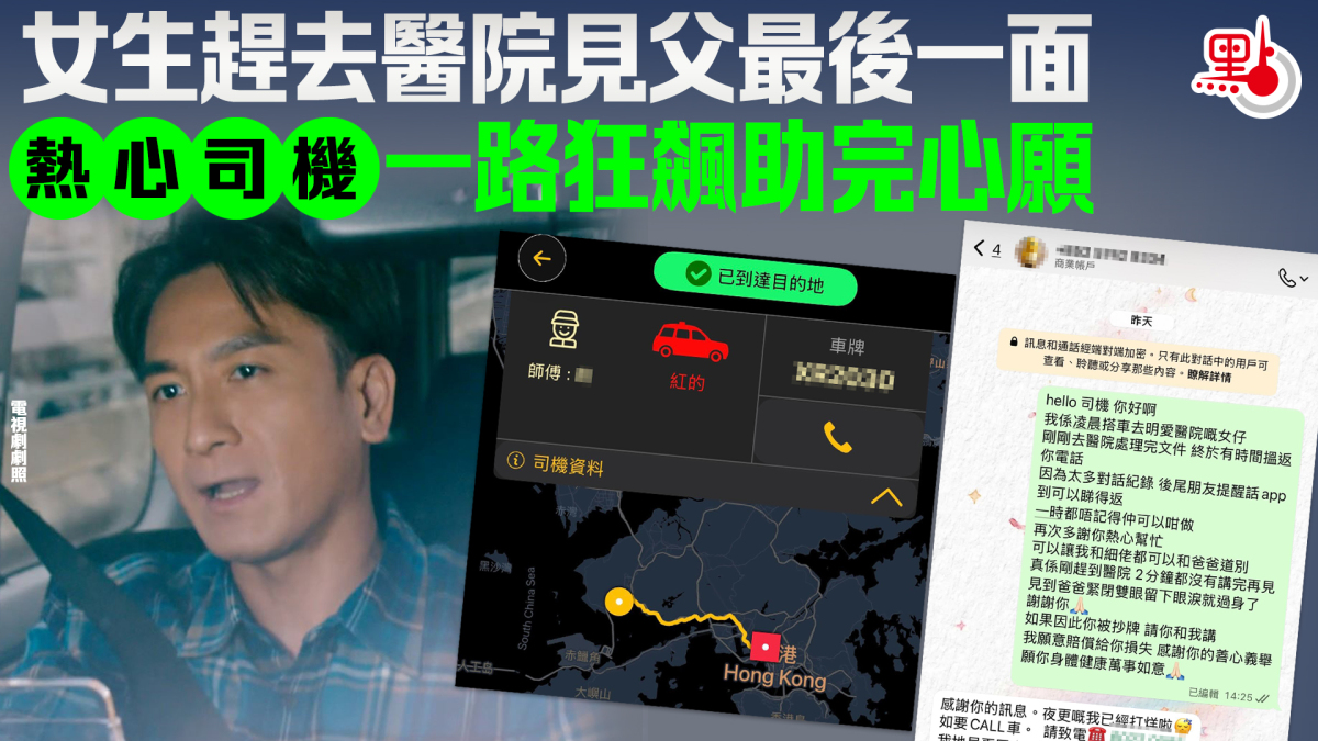 該名女生在社交平台threads表示,父親凌晨突然情況危急,於是電召紅的趕往明愛醫院。雖然上車時沒有說明情況,但司機聽到她同媽媽及屋企人的電話對話,便不停越揸越快,一路狂飆送她到醫院。落車時,知道樓主十分趕時間,直接免走尾數,讓她趕到見爸爸最後一面,安詳地離世。