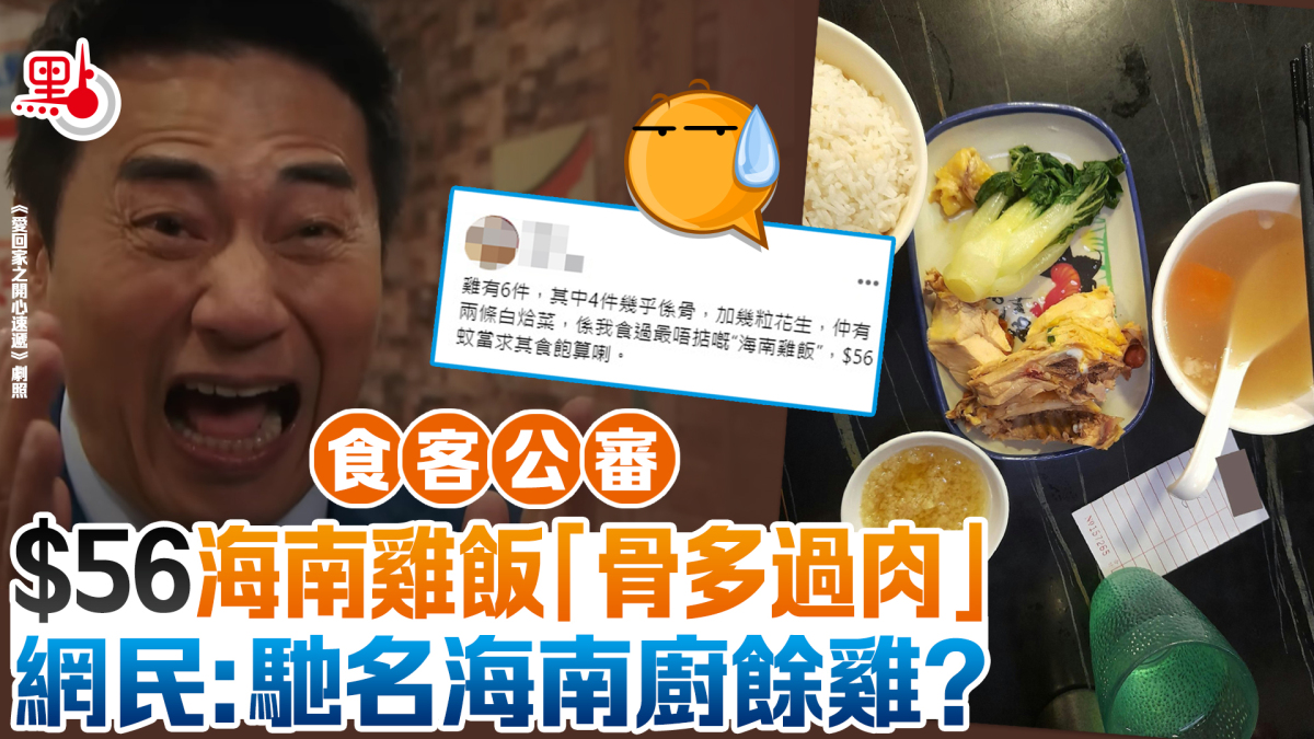 【點新聞報道】不少人外出吃飯時,都有「中伏」經歷。有食客分享日前在土瓜灣一間餐廳,點了價值56元的海南雞飯,結果上枱後發現賣相極差「骨多過肉」,直指是「最唔掂的海南雞飯」!