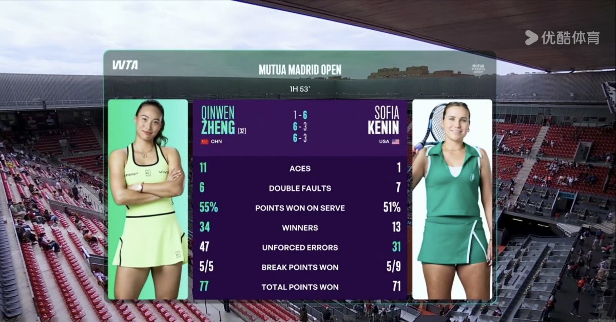 輸掉第一盤後,鄭欽文的手感逐漸恢復,贏下次盤將比賽拖進了決勝盤。不過,決勝盤依舊戲劇性不斷。她兩次和對手交替破發,最終在盤末抓住肯寧狀態明顯下降的機會,通過關鍵局的第3次破發和自身發球的威力,拿下了決勝盤贏得整場比賽。