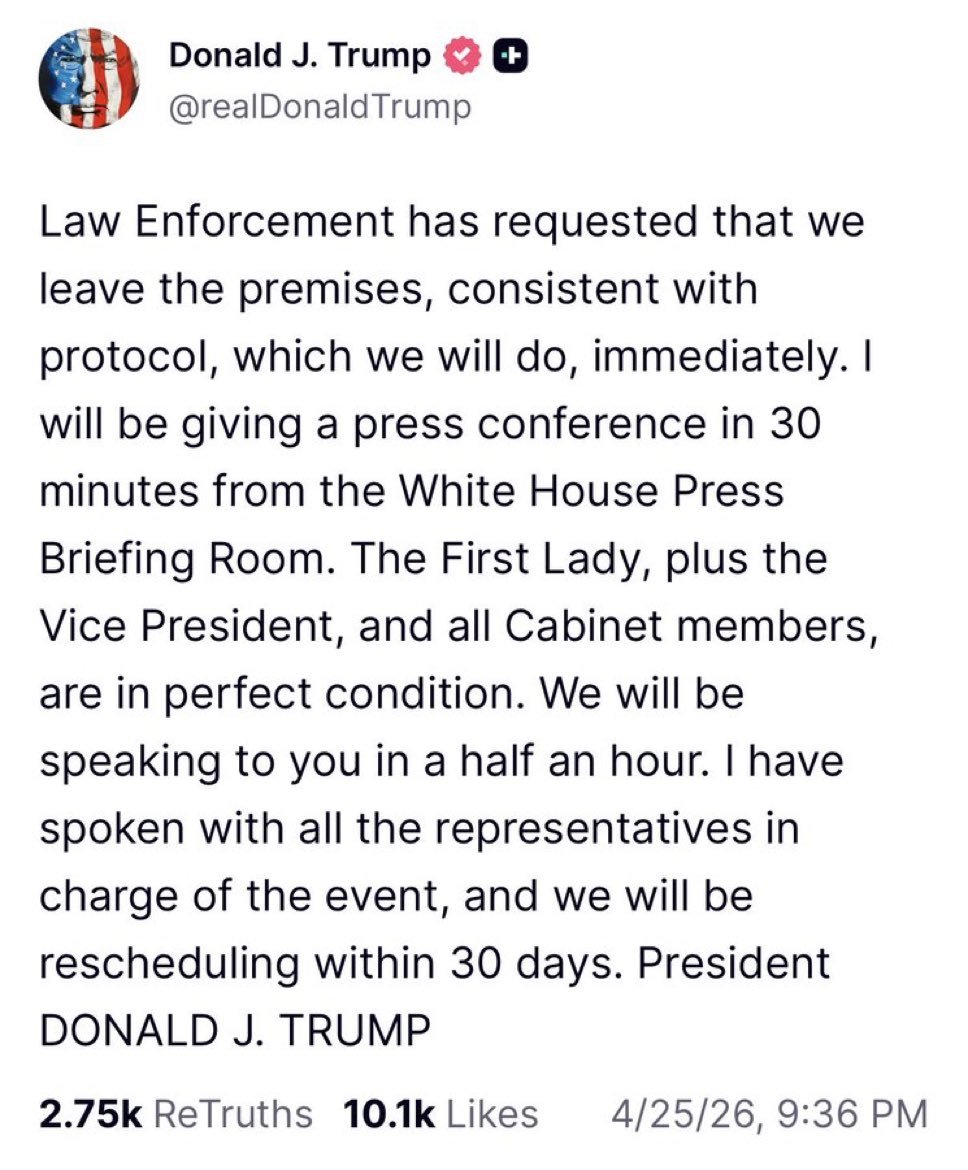 隨後不久,特朗普在「真實社交」發文表示,華盛頓特區度過了一個非同尋常的夜晚,特勤局和執法部門的表現堪稱出色。他們行動迅速且英勇無畏,槍手已被抓獲。特朗普說,他已建議讓記者協會晚宴繼續進行,但他將完全聽從執法部門的安排。無論最終決定如何,當晚的活動都將與原定計劃大不相同。