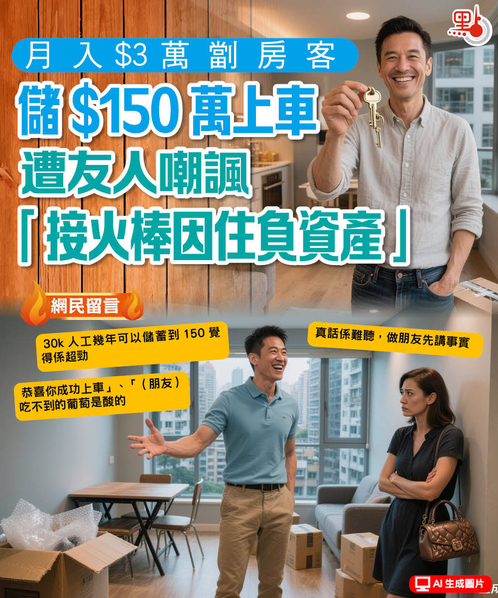 近日,有月入3萬的打工仔在Threads分享開心事,稱靠打工及投資獨力儲下150萬,買下400萬物業,感到生活質素大大提升,惟有朋友卻嘲諷他如今買樓如同「接火棒」,惹來網民熱議。