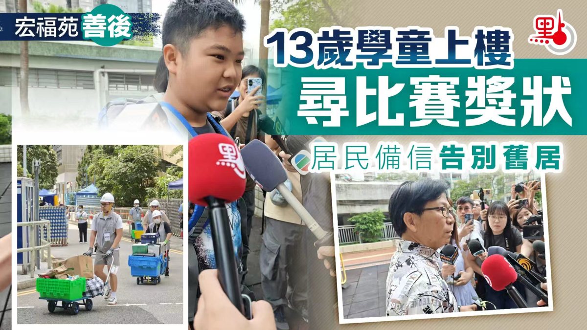 13歲的Eden今日與家人一同前往位於宏道閣15樓的單位。在經過約2小時的執拾後,Eden順利下樓,說成功執到獎狀,但家中還有許多物品,想「再上去拎多次」。他還透露,上樓的要求是其主動提出,「都系想見返屋企最後一面」。
