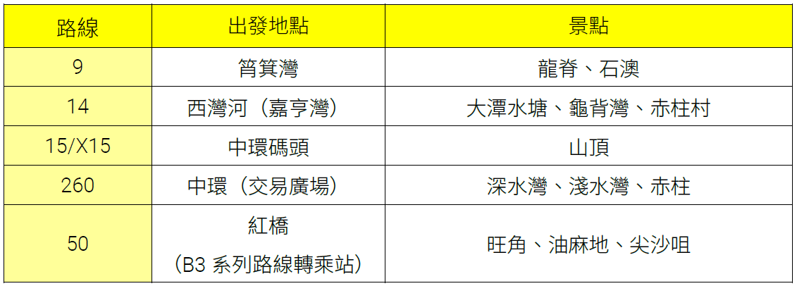 城巴於五一黃金周期間,將加強多條熱門旅遊景點路線服務,助旅客輕鬆前往各大打卡熱點。旅客可乘坐石澳9號線登上「亞洲最佳市區遠足徑」龍脊,亦可乘坐15及X15號線以雙層巴士嶄新高度登上山頂,沿路遠眺維多利亞港景緻。此外,「H2K夜賞香港」等開篷巴士路線亦將延長服務時間。