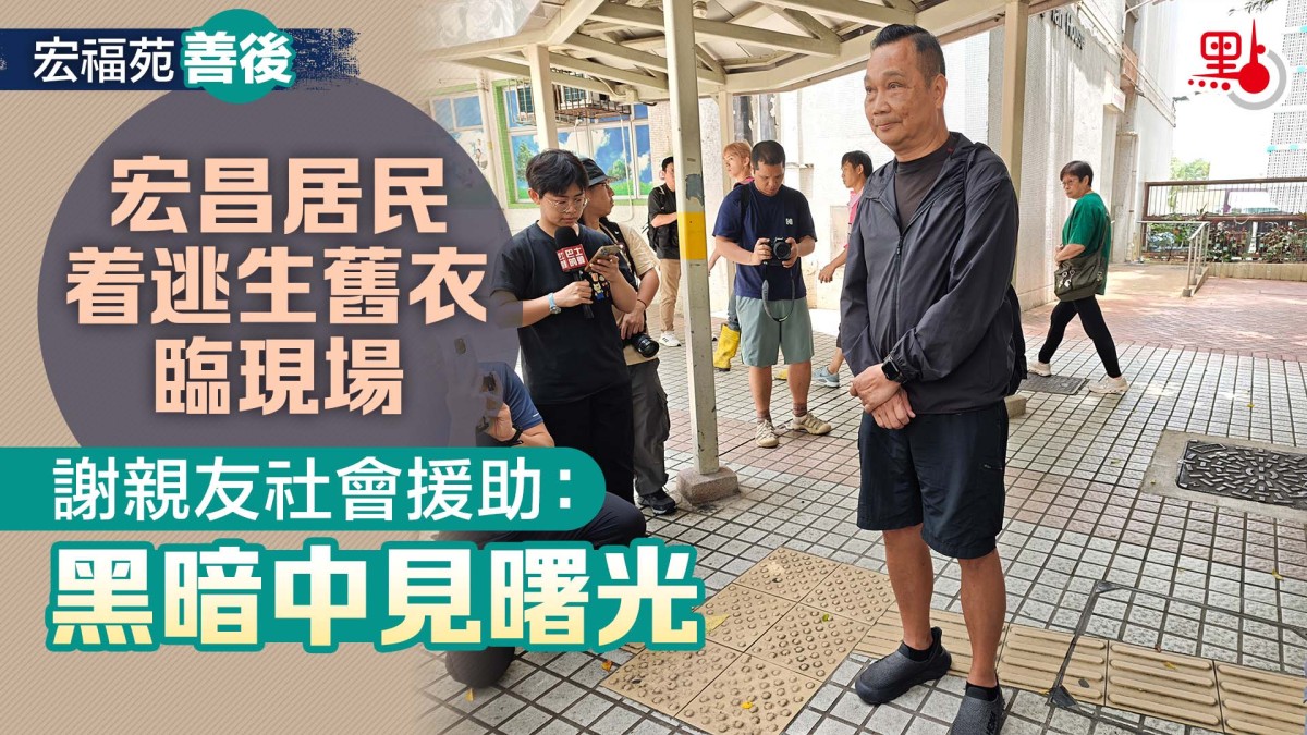在廣禮樓對開的下樓出口,宏昌閣21樓居民胡先生在等候完成執拾的家人與朋友。他因在火災中腳部受傷,無法親身返回單位,對此深感遺憾。