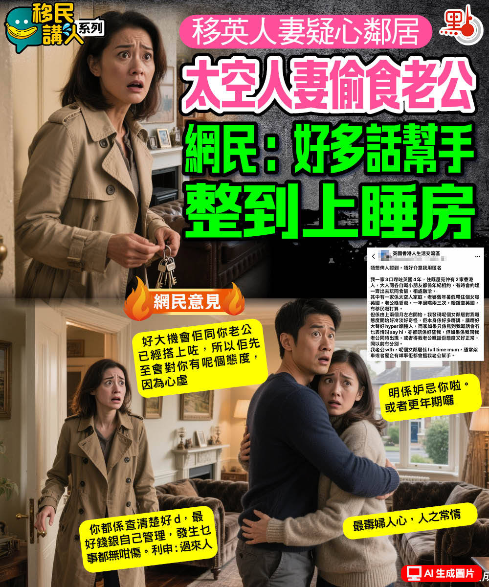 【點新聞報道】移民確實令不少大好家庭破裂,皆因在陌生且充滿壓力的環境中,疑神疑鬼的負面情緒容易滋生,危及婚姻關係。近日有一名移民英國的人妻在網上發匿名帖文,大呻懷疑老公偷食,話有隔鄰的「太空人」家庭,一名獨自攜女移民的港媽,經常背地裏聯絡人妻老公幫手,令她不禁生疑「想問下咁樣嘅情況會唔會係我諗多咗?」。
