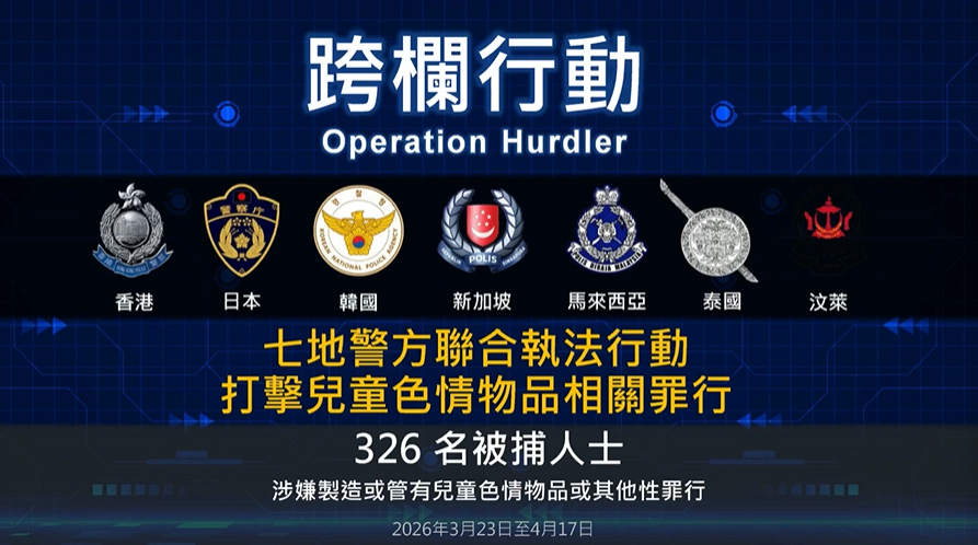 【點新聞報道】近日,警方發現有人經網上或點對點分享軟件,下載及分享兒童色情物品。經調查後,香港警方聯同新加坡、馬來西亞、日本、韓國、泰國以及文萊警方,於3月23日至4月17日展開執法行動。行動中,警方拘捕9名本地男子,年齡介乎18至61歲。7地警方合共拘捕了326名涉案人士,涉及的罪行包括製造或管有兒童色情物品,以及其他嚴重罪行。