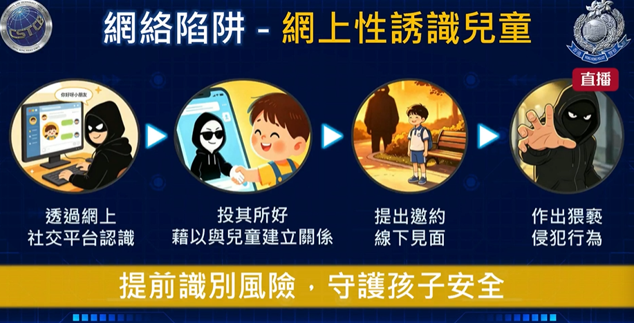 警方指,在這宗案件中,28歲男子與受害男童透過社交平台相識,他們最初在網上聊天,發展共同興趣。這名被捕男子投其所好,其後發展到線下會面,繼而向受害男童作出非禮行為。警方呼籲家長,要留意子女使用社交媒體的習慣和情況,避免小朋友落入不法之徒手中。