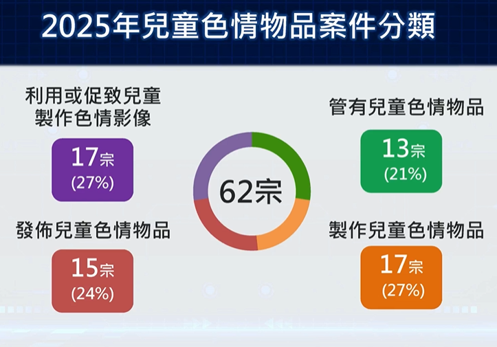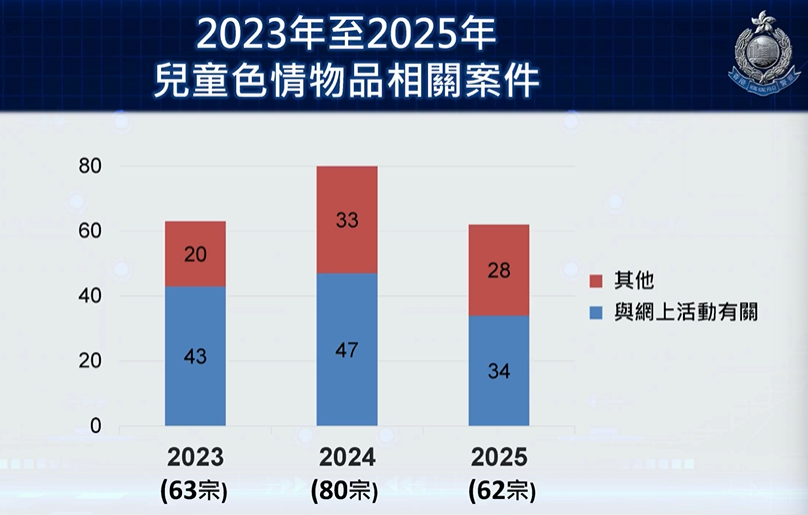2025年,警方共錄得62宗兒童色情物品相關案件,較2024年的80宗下跌18宗。當中超過6成(38宗)案件與網上活動有關,犯案者主要透過交友平台、社交程式或網上遊戲等,從線上認識受害兒童。雖然案件數字較2024年減少,但佔整體案件的比例,便較2024年微升2.5%至61.3%,反映網上兒童性誘識的情況仍存在頗高風險。這些網上活動相關的案件,受害兒童主要是女性,超過7成年齡介乎12至15歲,年齡最細只有9歲。