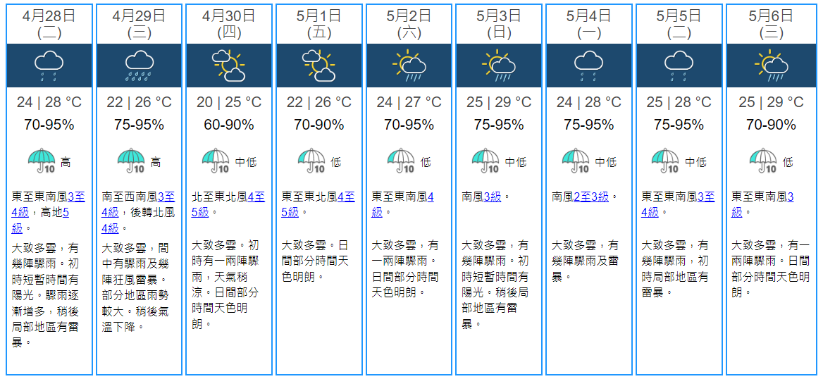 天文台預測本港地區今日天氣大致多雲,有幾陣驟雨,初時短暫時間有陽光,驟雨逐漸增多,稍後局部地區有雷暴,吹和緩東至東南風,高地風勢清勁。展望明日部分地區雨勢較大及有雷暴,稍後氣溫下降。星期四早上最低氣溫約20度,驟雨減少,本周後期日間部分時間天色明朗。