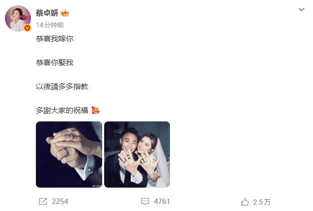 【點新聞報道】蔡卓妍(阿Sa)今日(28日)在社交平台官宣結婚,並配文「恭喜我嫁你,恭喜你娶我,以後請多多指教,多謝大家的祝福!」