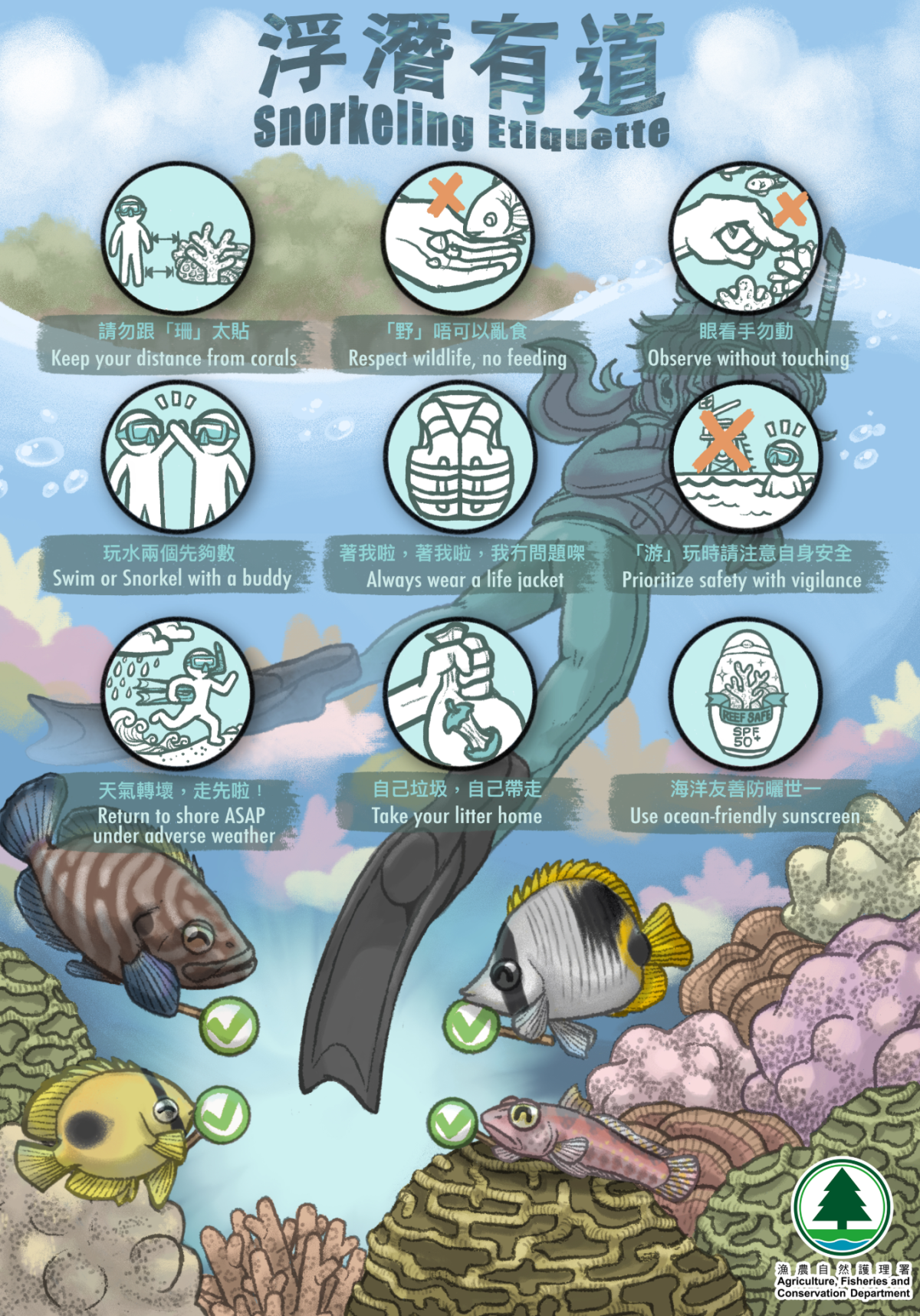 此外,漁護署亦將珊瑚友善路線地圖印製於防水圖卡上,派發予浮潛嚮導作講解之用,及設迷你版圖卡派發予浮潛人士,卡背面列出浮潛守則,方便他們在浮潛時隨身攜帶參考。另外,漁護署將透過內地社交平台宣傳教育,通過小紅書、微信公眾號等呼籲大眾一同守護這片「世外桃源」。